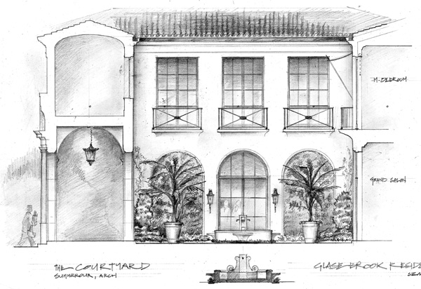 Fun details abound. They actually cast that door knocker. One detail that I don't think was realized is the clay pot buried in slate chips and piped as a drain under a downspout. Can't have it all. . . This and following, my work with William T Baker. Here is my first rendering for his design of a home on a wooded site in North Carolina. The perspective is a little contrived as there is a giant shelf of rock protruding out of the ground in the foreground that would obscure the house from this distance. With Bill Baker. . .A residence we're working on in Alys Beach. First we had lanterns flanking the entry, then they went away because we thought we couldn't have lanterns because of the turtles, then the architectural review board suggested we put lanterns flanking the door. So now we have lanterns.