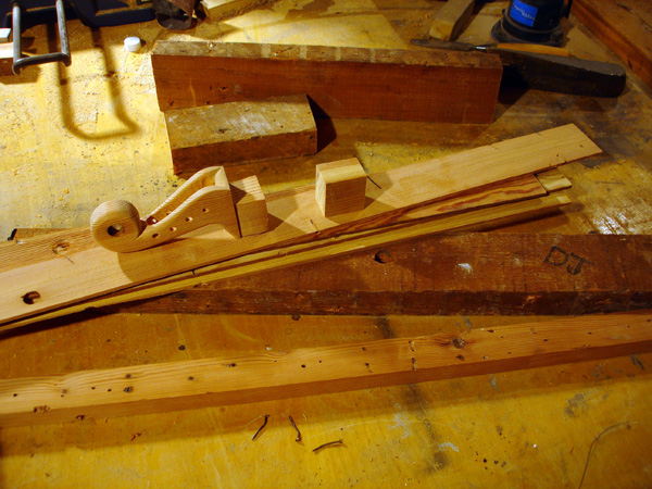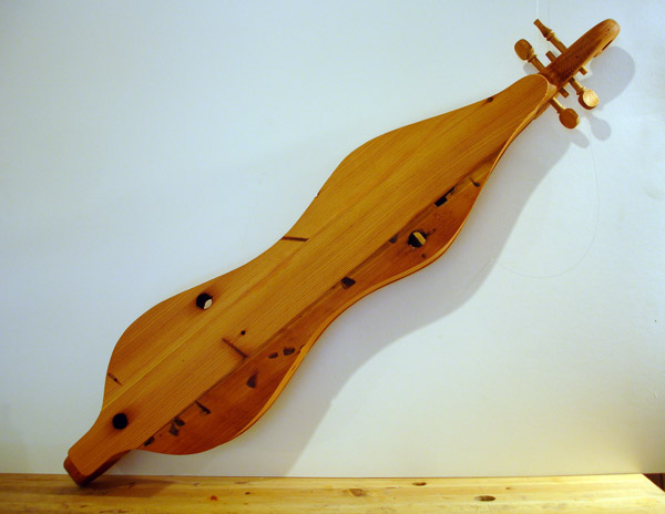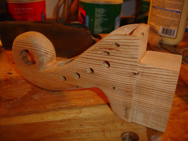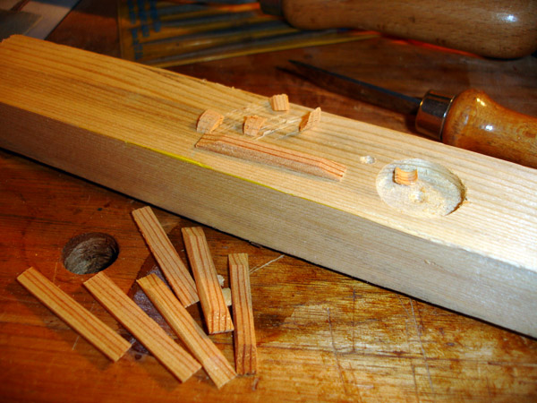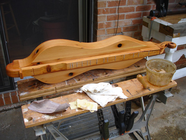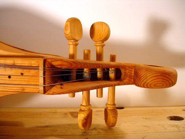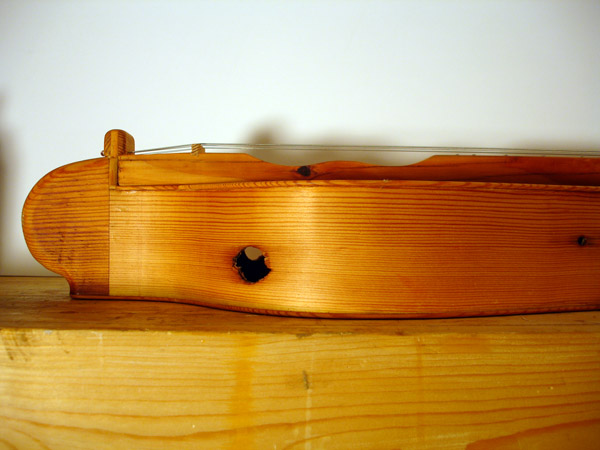 The top is attached and the edges are being trimmed. A hallmark detail of the earliest dulcimers is the presence of 'overlapping edges' as opposed to flush edges that are used on most modern instruments. This detail is reminiscent of the fiddle, which was probably the most familiar 'store bought' instrument to the rural makers. The gap visible between the end of the fingerboard and the end block is for the insertion of a string holder. Since I am making all the parts of the instrument from pine, this piece will have to be firmly rooted. The string holder being glued up. Gorilla glue. The pegs will have a nice round, basic shape and be as thick as my reamer will allow. Although I've seen alot of rural, early dulcimers with pine friction pegs (usually with square heads because they were carved by hand) it is not a good choice because it is far too soft a wood. I am going through the pains of ensuring that every single piece of the instrument (except the frets!) is made out of that one pine stud. The pegs of this instrument will have to be well soaped to reduce binding and twisting of the shaft.