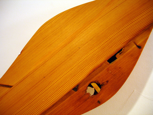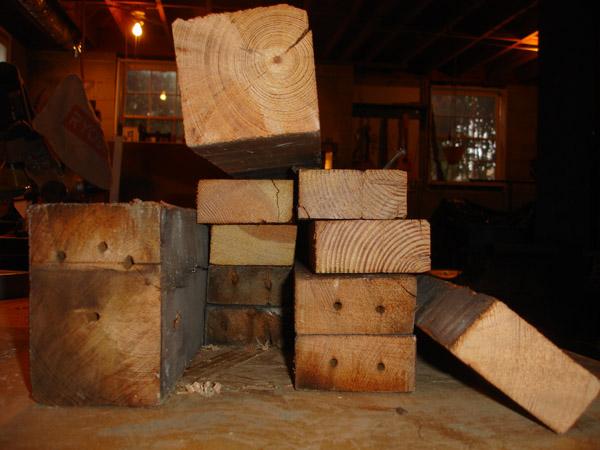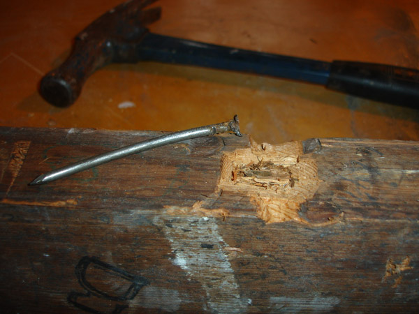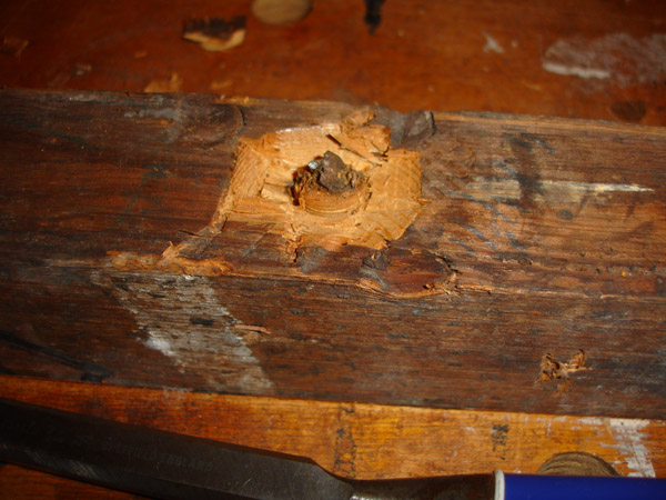 Here are some shots of preparing the wood. First all nails and bits of whatever have to be removed. This nail is driven in at such an angle that a plug cutter couldn't get around it.