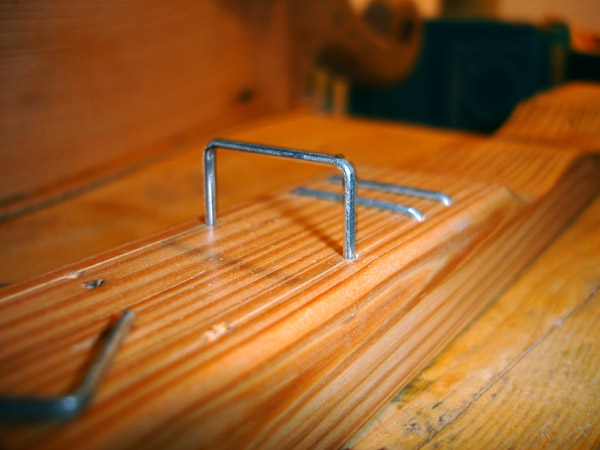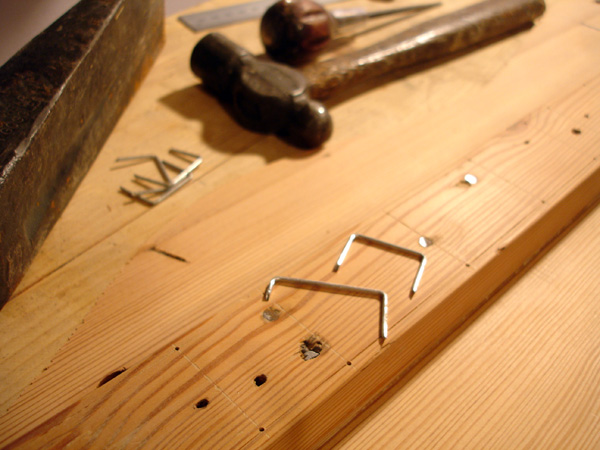 The frets of the earliest dulcimers were often fence post staples or bent nails. Here I am using a 1" wide industrial staple which is very similar to an early packing crate staple. In some cases a guide hole lined up with an old plaster lath nail hole.