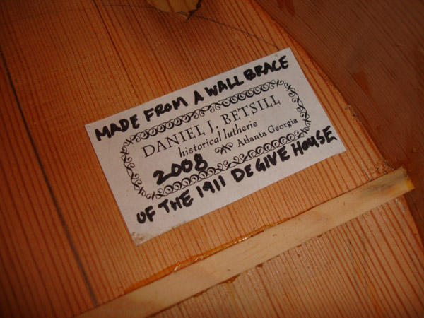 Another "DeGive" Dulcimer in the works. Showing here the raw material, the studs of the 1911 DeGive House in Ansley Park, complete with my marker tag to the contractor designating which pieces I wanted salvaged. The sides and back pieces are sawn and planed, the scroll and endblock are complete and the fingerboard is planed to size, with a few objects of ejectus.