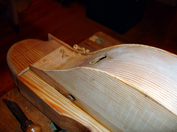 Like many of the old makers, I am leaving my scribe marks: the lines I made to position the drill holes for the frets. When I pick up an old instrument, I like seeing the evidence of how the maker worked. |