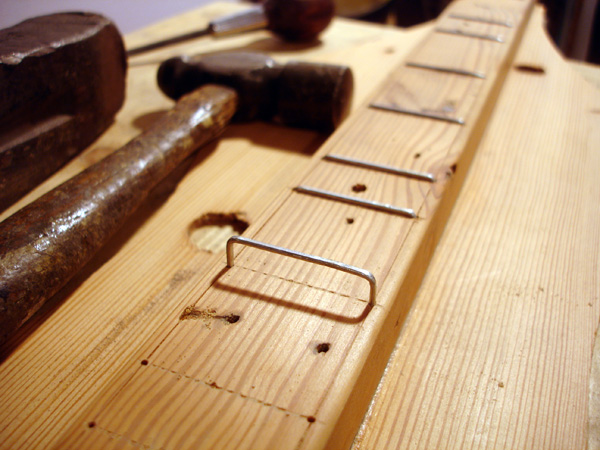 After the frets are in place the fretboard could be glued to the top. The old plaster lath nail holes make an interesting background pattern.