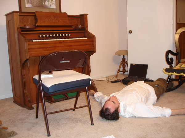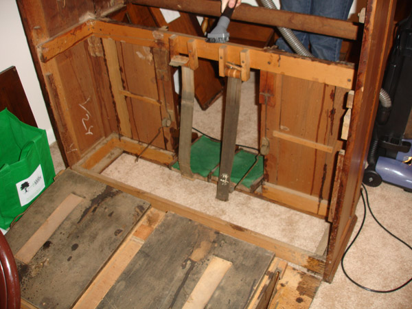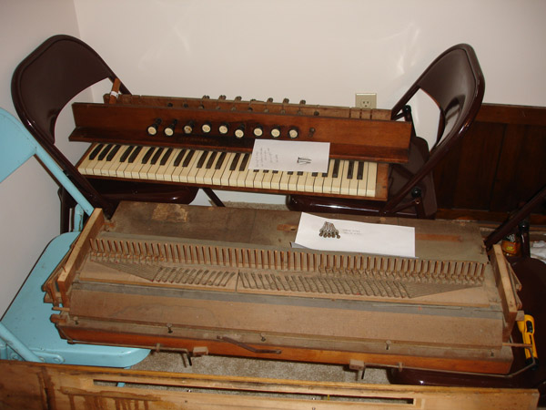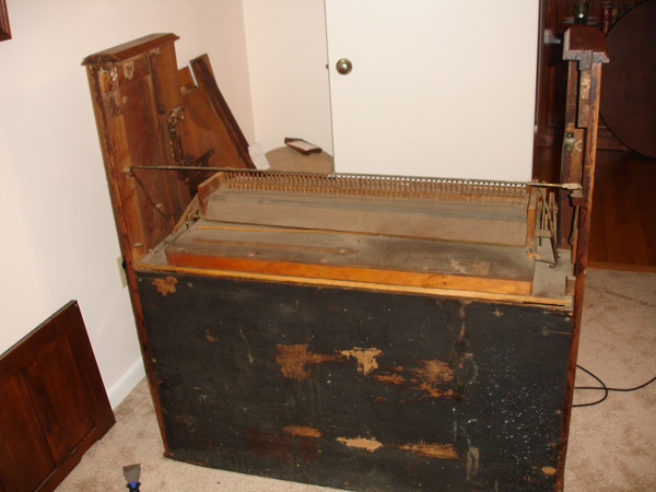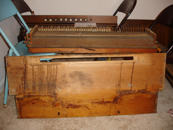 The key and reed assemblies are laying on chairs in the background. The upper casework panels and music stand are propped against the wall. The bellows assembly is just behind the case leaning against the chairs.