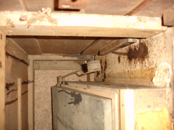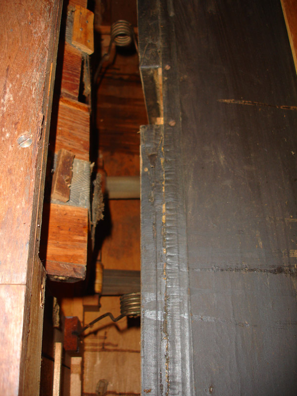 Reverse view looking up into the bellows chamber from the bottom of the organ