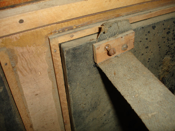 Reusing the cleat at the top of the exhauster bellow. Ornery malevolent 1902 flathead screw, modern drywall screw. I am so sick of slotted screwheads after this job. May we pause for a moment of quiet admiration for Mr Phillips.