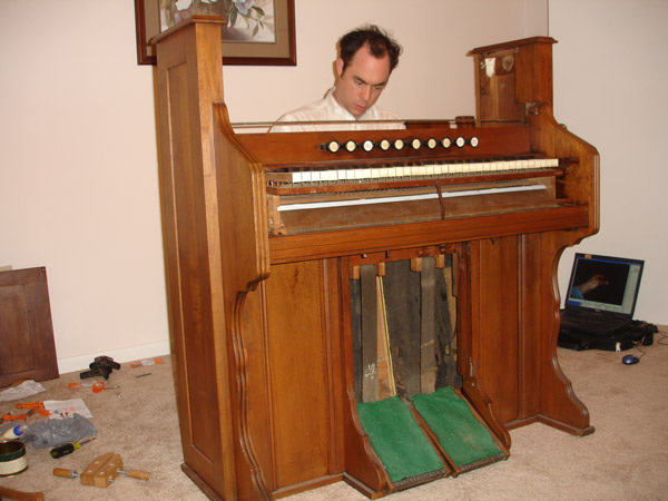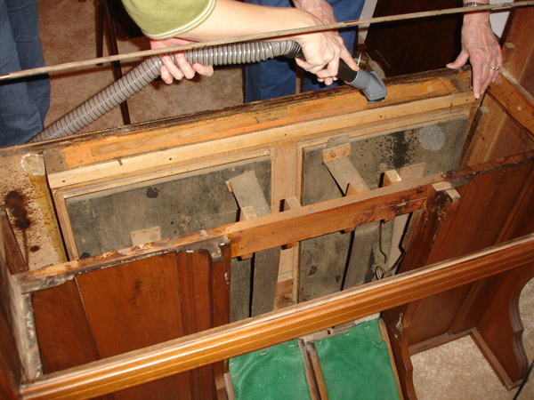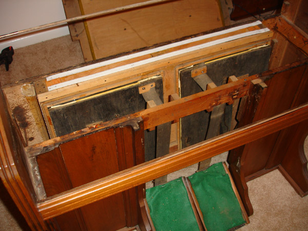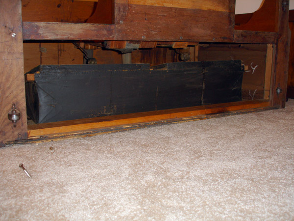 The bellows are back in place, new gleaming white gasket felting clearly visible. The green felt at the pedals is, needless to say, not original and will be replaced at some point by Shannon's needlepoint.