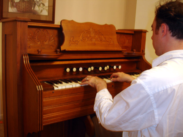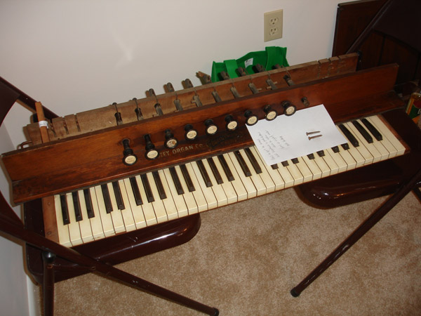 And in conclusion, a summery of the controls. The stops from bass to treble are: Bass Coupler, Principal 4ft, Vox Celeste, Dulcet 8ft, Forte, Tremolo, Echo 8ft, Diapason 8ft, Oboe 8ft, Treble Coupler. The left hand paddle below engages both bass and treble couplers, and the right hand paddle opens up both front and back dampers, making the volume increase. There were three labels missing and Shannon affected the right font and suitably antiqued the paper to blend. We were in a quandary as to what the plates originally said. Long story short, her ample research lead to creativity. The couplers, as implied, couple center keyboard keys with their octave counterparts and create a fuller sound. The two center knobs separate the bass and treble voices. "Forte" opens the front damper and increases the volume slightly. "Tremolo" engages the "Vox Humana" windmill and creates a subtle tremolo effect by pulsing the air being drawn into the rear treble reeds. Thus it is only effective when those reeds are un-muted, this being the "Oboe" On the treble end, "Echo" is the quietest, opening the front treble mute slightly. "Diapason 8ft" opens the front damper completely and is that much louder than "Echo". "Oboe" opens both front and rear mutes all the way and thereby makes the greatest sound. On the bass side is a similar progression. "Principal 4ft" is the rear reeds open, and these are treble pitched. "Dulcet 8ft" is the front mute slightly open. "Vox Celeste" is front and back mutes both fully open. Some of the stops negate the others. If "Oboe" and "Vox Celeste" are both open then the other two stops for treble and bass are non-operative. "Forte" is inoperative if the right hand paddle is engaged. So "pulling out all the stops" on this instrument would be "Oboe", "Vox Celeste" out and both paddles engaged. It's quite an odd playing posture while pumping the peddles, I can tell you that. Watch this space for the restoration of my long-suffering "Missionary's Organ" or as I have recently come to understand is know as a Melodeon. +++++