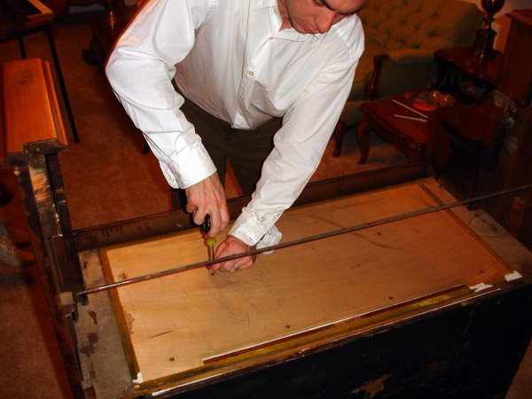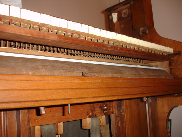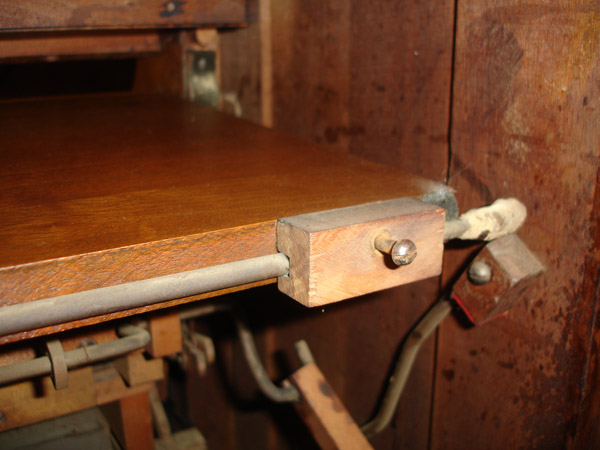 The octave coupler goes on top of that. If you see a foreign implement here, that's a shoe iron used as weight to hold down a glue job to a central damper block. So central it is out of the reach of any clamp known to man. But this was a good dinner break.