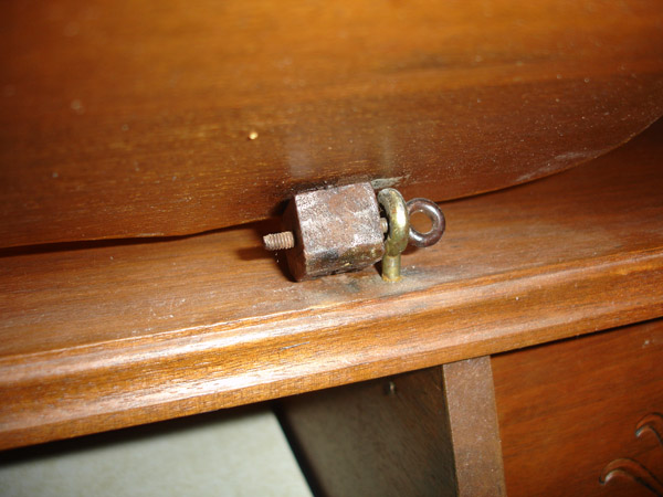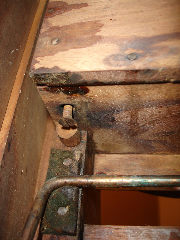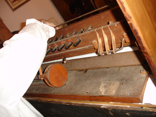 Music stand pinion. +++++ Following are images during restoration. The primary occupation was repairing the leaks in the bellows with chamois and "tear mender" glue. And much cleaning, including the eviction of a dirt-dobber's condominium.