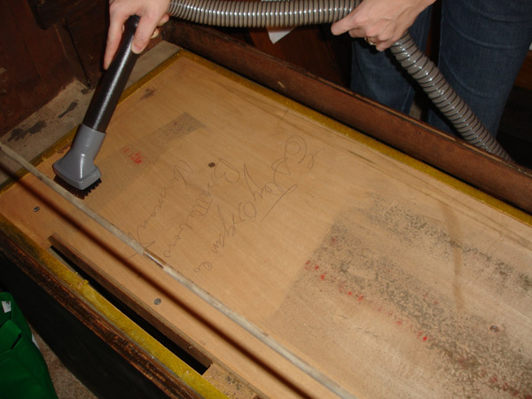 Besides the bellows, the other obvious air leak was in the valve plate, at the joints between the butt joined boards. She had to remove some of the valves to do this and we saw the decades of coal dust on the leather pad.