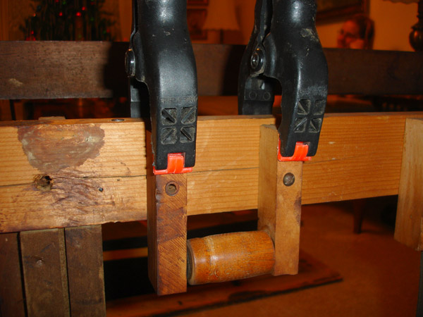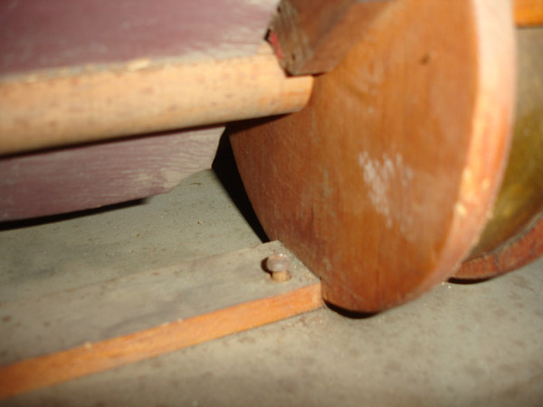 I couldn't figure out how the knob fit on to the stop dowel. It looked like it was just butt-joined on there. The extant knobs had a small hole tapped all the way through suggesting there was a small central dowel that ran into the stop shaft, but the one that was missing had no broken-off dowel centered in it. Anywho: I turned a 1/4" dowel on the end and tapped a hole in the end of the stop shaft.