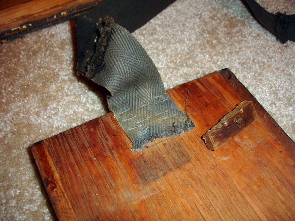 The straps were rotted and need to be replaced. This one was already spliced from a previous repair. There was a well-worn cleat which was vestigial considering the fanatical stapling.