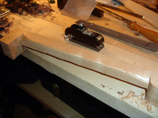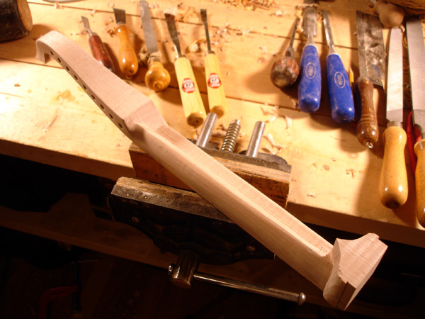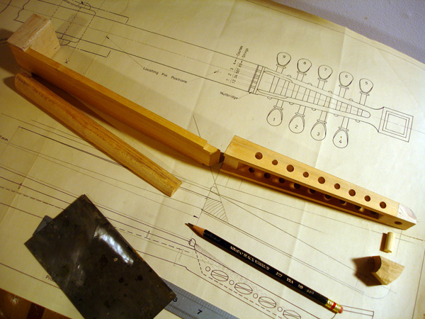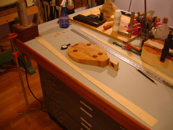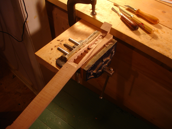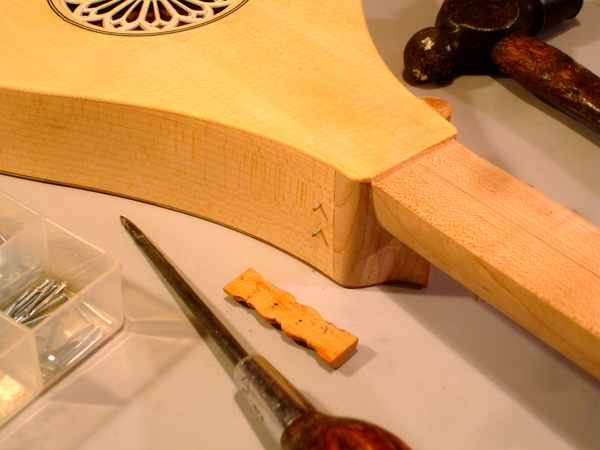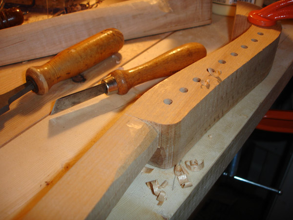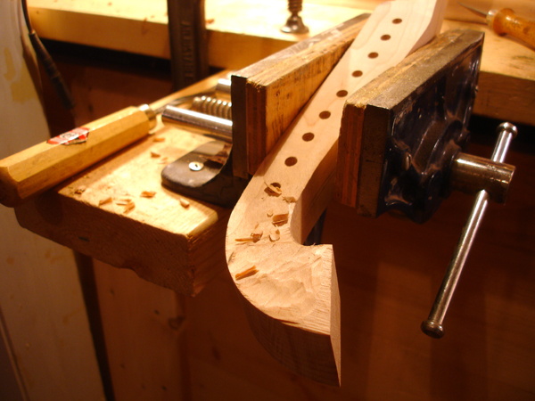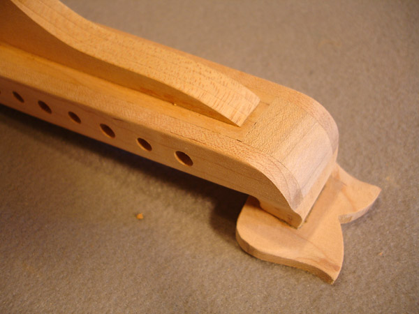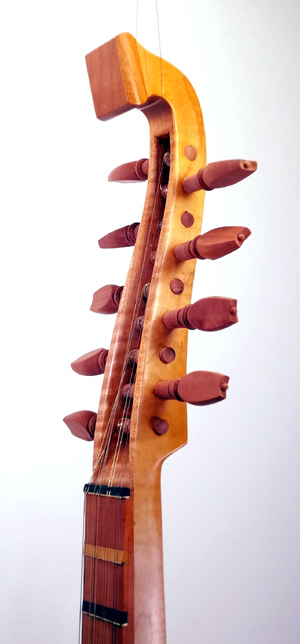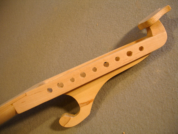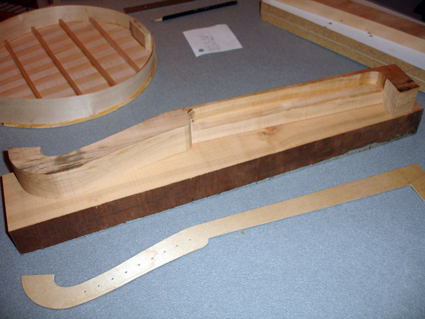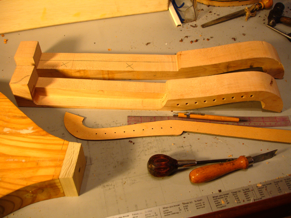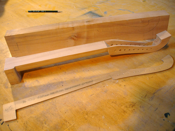 To the Proficient Scholler or Lover of the Cittharn. . . The "Renaissance" cittern of 16th and 17th century Europe is my favorite instrument, both to make, as a luthier, and to play. It is a delightful, light, wire-strung instrument that has a substantial solo repertory, as well as being a staple of the broken consort. Its sound when used in continuo is plucky and rhythmic, sounding in range from the cluck of an Appalachian banjo to the marching calculation of the harpsichord. When heard alone, it defies comparison to any other instrument: an unmistakable sound. The following is a summery of my work with the instrument. Stages of the tenor cittern neck/pegbox. My own pattern based on historical shapes.