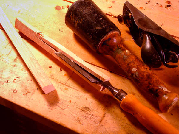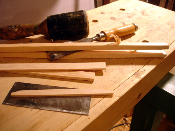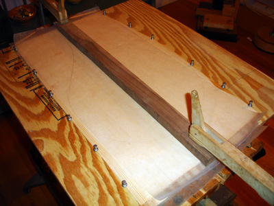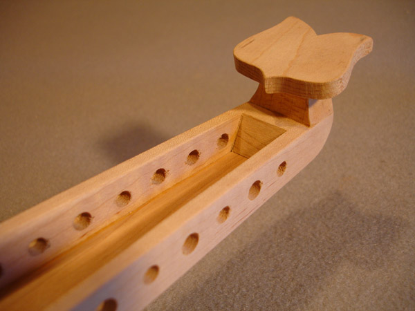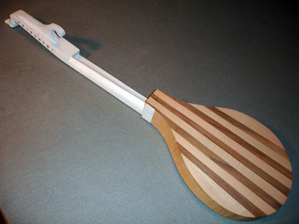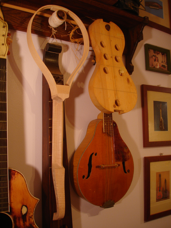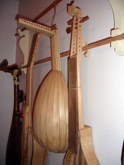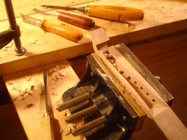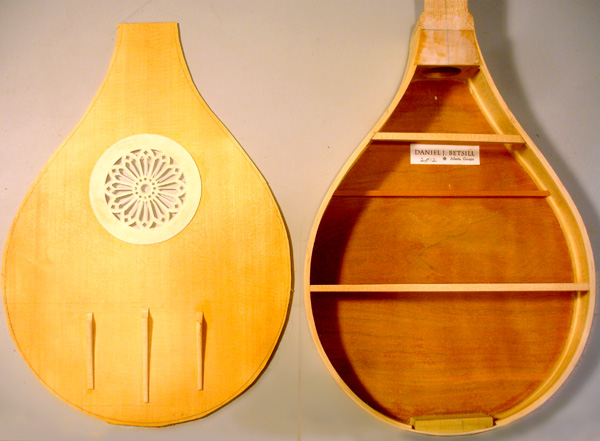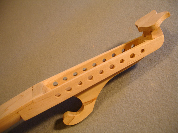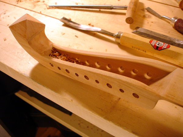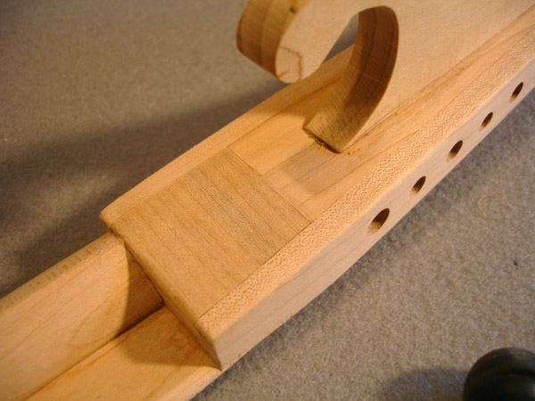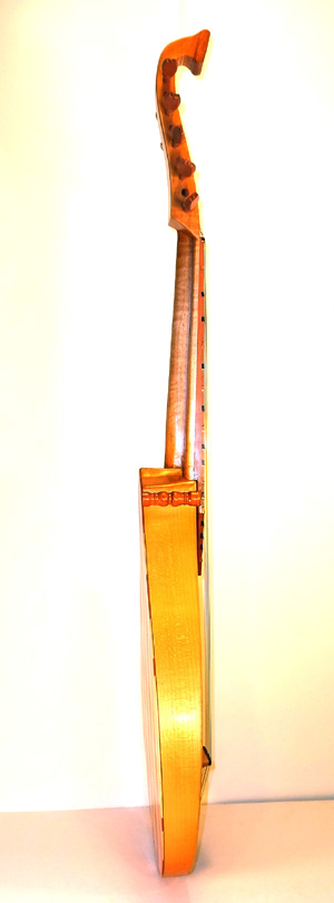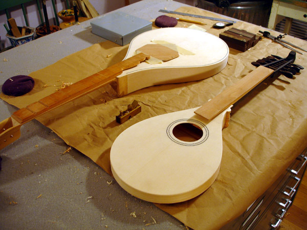 To the Proficient Scholler or Lover of the Cittharn. . . The "Renaissance" cittern of 16th and 17th century Europe is my favorite instrument, both to make, as a luthier, and to play. It is a delightful, light, wire-strung instrument that has a substantial solo repertory, as well as being a staple of the broken consort. Its sound when used in continuo is plucky and rhythmic, sounding in range from the cluck of an Appalachian banjo to the marching calculation of the harpsichord. When heard alone, it defies comparison to any other instrument: an unmistakable sound. The following is a summery of my work with the instrument. Stages of the tenor cittern neck/pegbox. My own pattern based on historical shapes.