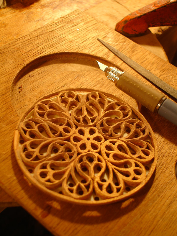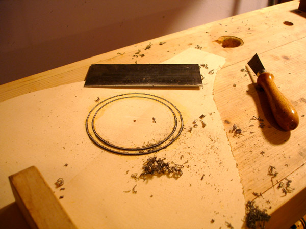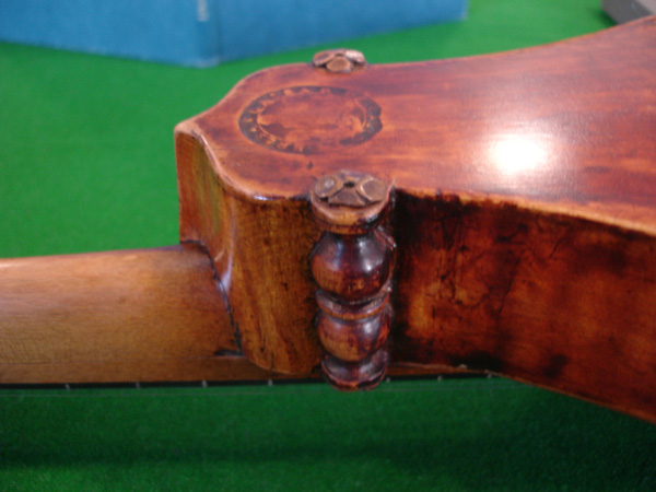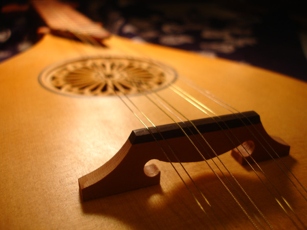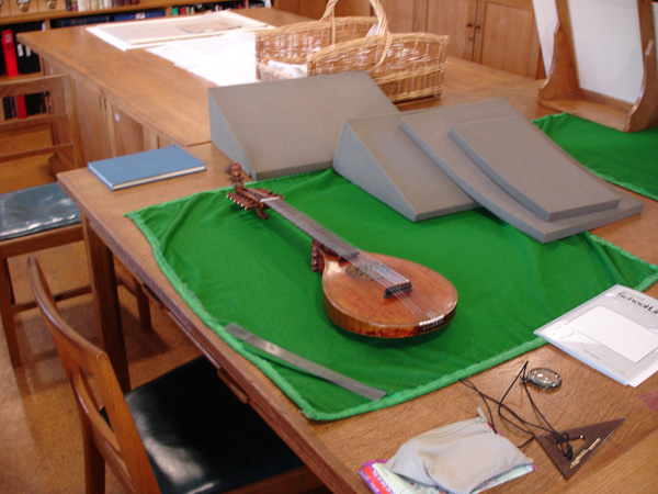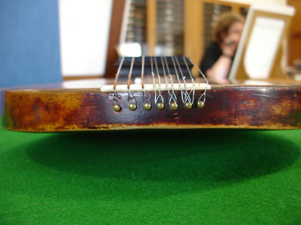 Rosette by Steven Winiarski of Atlanta, styled after the rose window of the Duomo, Florence. Arty shot #1 Arty shot #2 Link to video of me playing this instrument. Still working on my Mark Cudek "cluck". +++++ Research I have crossed paths with many citterns over the years, both antique in collections and modern reproductions. Each time I meet a new instrument I take notes, and hopefully, pictures and a tracing. However with out a doubt the finest specimen I have been in the same room with is the DaSalo in the Ashmolean Museum, Oxford. Following are excerpts from my study photographs of this instrument. The study area: the Map and Print Room, where photography with a flash and tripod is prohibited. I found that out only after I had lugged my tripod through many train stations. I also was breaking in a new digital camera which did not function well in low light: this explaining the poor quality of many of the images. It was the experience that counts. The end pins which look suspiciously like modern brass tacks. Perhaps a substitution of the Hills? We know this is not the original stringing. The master's stamp Despite their draconian restrictions on tripod use, I must say that they were terribly accommodating in providing me with this Hill collection catalog to serve as my backdrop. Here ends the Leffon. +++++