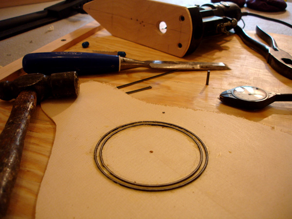 Process photos of various DaSalo models Carving the pearwood rosette after piercing with the jeweler's saw. +++++ I call this my 'constructed neck' cittern. After carving endless thumb channels and pegboxes out of one solid piece of wood I have contrived to build this unwieldly shape out of an assembly of easily planed and joined pieces of wood. Besides being held together entirely by glue, the only design liability I have found is it is less condusive to gently curving pegboxes (however the Ashmolean DaSalo is straight), and the pointed heel has been replaced with a less elegant 'flat'. However on the other side of the coin, it took me about 4 hours to make the entire neck and pegbox. And after I gesso it and paint it black you'll never know. Showing the components. Note the hook is laminated to prevent future destruction. The seams of the 'cheeks' and 'blocks' are clearly visible. Hanging around with a friend. Turning the scroll for a tenor out of cherry. This is the Ashmolean shape. The same design in walnut sized for the standard instrument And this trapeze act is the gluing on of the scrolls. Note at this point the neck/pegbox of the constructed cittern is painted. Question: If Stradivarius had a spiral downcut purfling cutter, would he use it? Answer: yes. I usually put two rows of purfling around the rose and one around the edge. The Ashmolean has two around the edge and none around the rose. The constructed neck cittern gets the top and braces attached concurrently. The latest DaSalo has top attached and pegs turned and is awaiting fretting. The tenor is in progress of fretting (the fingerboards are unattached) Here is my English backcut saw. What's wrong with that sentance? I give the English, especially of Sheffield, full credits for handsome saws and superior steel, but why anyone in the world is still making push saws since the Japanese arrived I do not understand. I pounded the blade out of the brass spine, reversed it, and then tapped holes for a depth gauge, et volia, my Japanglish fret saw. My beloved dozuki's blade is the right thickness for the tangs of modern fretwire, but I needed the beefier English Gent's Saw blade to match the brass stock I use for the DaSalo frets. Following are finished images of a constructed neck cittern. This particular instrument has a motley assortment of peg woods: rosewood, wormy rosewood, ebony. Showing the individual parts of the constructed pegbox before glueup.