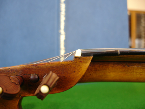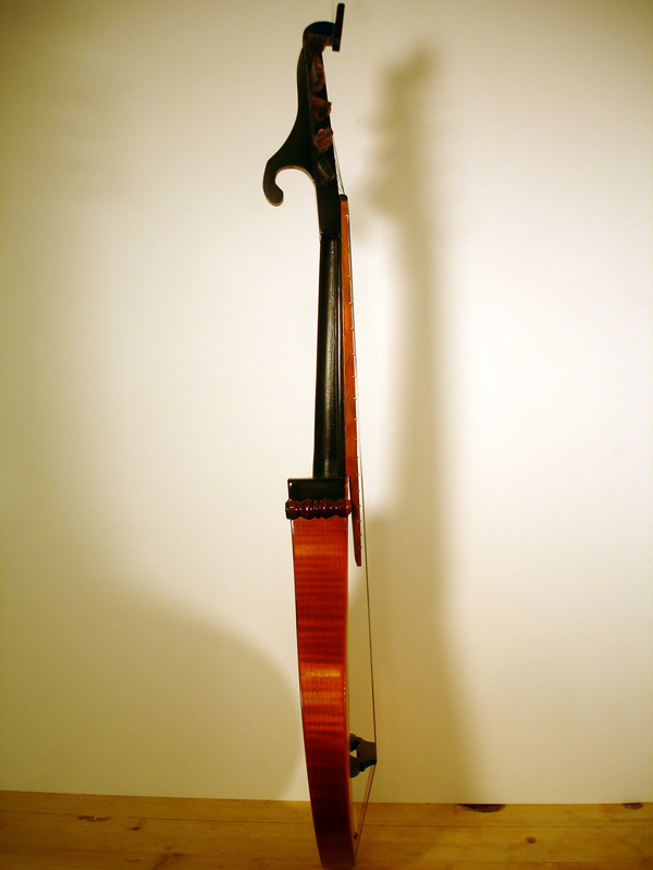 A version of the Ashmolean DaSalo, styled after the Early Music Shop (Bradford) kit, strung in four courses bb-GgG-dd-ee. Pearwood fingerboard, maple costructed-type body, carved neck/pegbox, striped cherry back, rosewood pegs and scrolls, brass frets with scalloped fingerboard and ebony bridge with brass saddle. Link to video of me playing this instrument. EMS has offered this instrument as a simplification of the Ashmolean instrument since the early 1980's. I got my first kit from them in 1988 and have since put together a friend's kit and built several other instruments of nearly the same specifications by making templates from the original kit parts. I'm finally getting away from copying this instrument however, now that I've inspected the original in the Ashmolean. The gothic rosette of the EMS kit is not the rosette of the original instrument, which is quite different (see my study images below) +++++