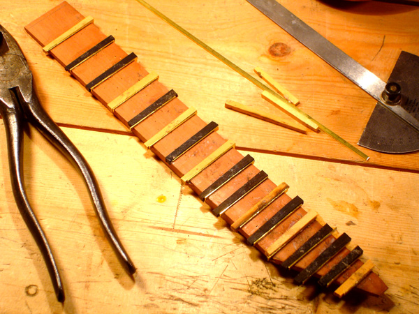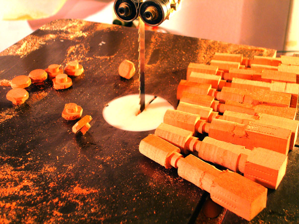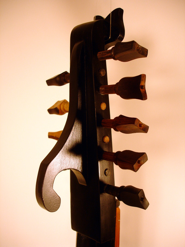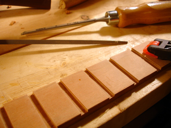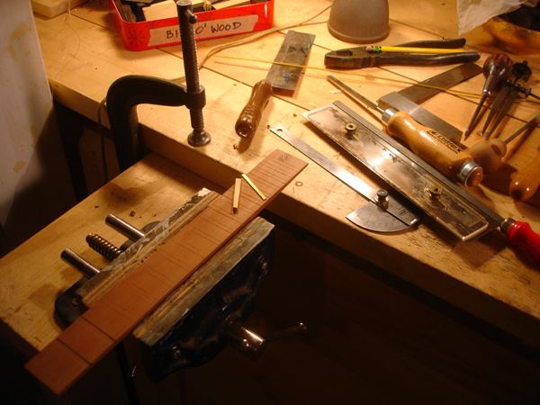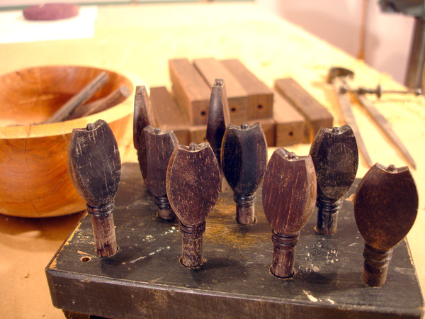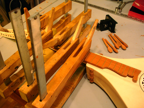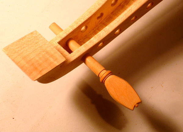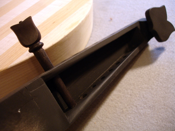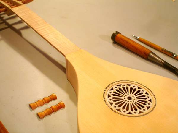 Following are some images related to the cittern fittings: making the boxwood and ebony fretboard wedges, the pegs, scrolls, pyramid pegbox head cap. The