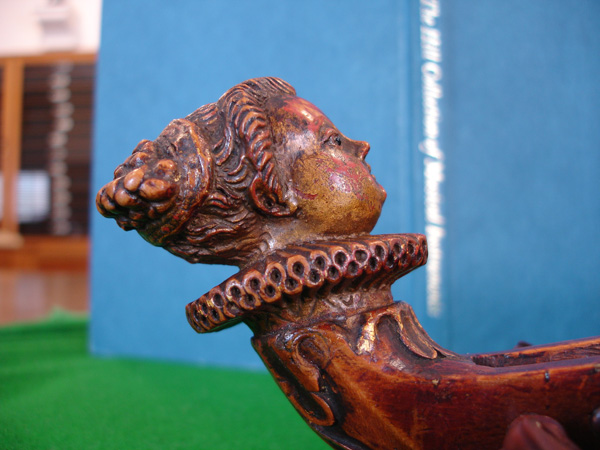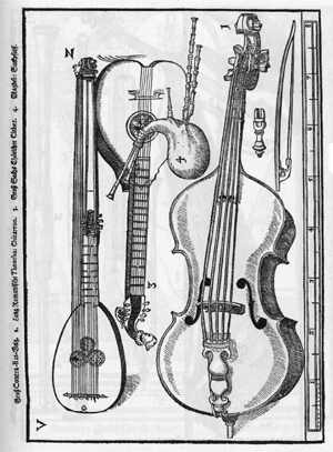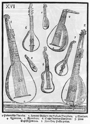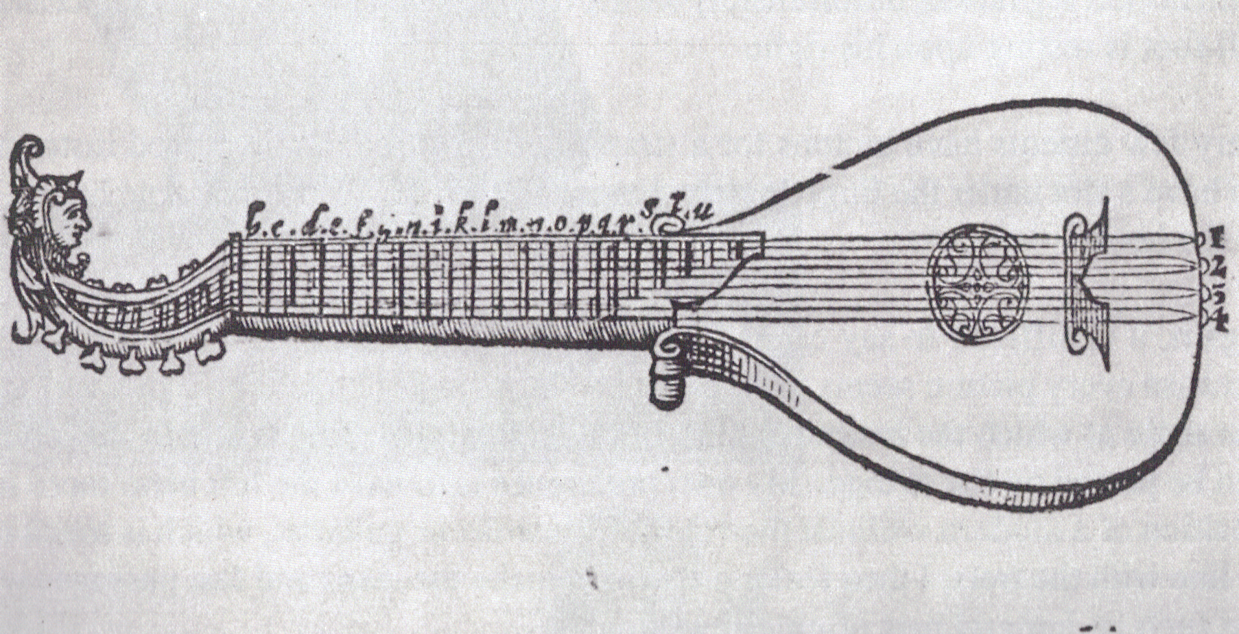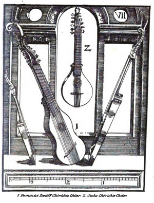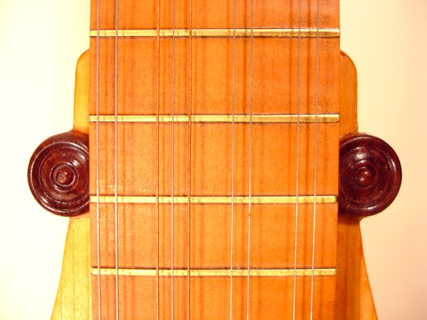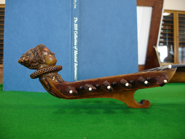Praetorius has not one but three plates depicting citterns. Plate VII shows two in side profile, the one on the right having a bass extension. Also in this plate is a guitar-shaped orpharion. Plate XVI shows an early continental style with occipital pegs (6) and a cittern which he describes as 'English' (7). Plate V has an atypical body shape hidden behind a bagpipe. The ubiquitous Robinson engraving shewing the positions of the frets Detail of the scroll covers of the Tenor.