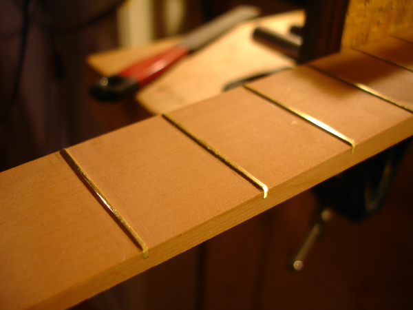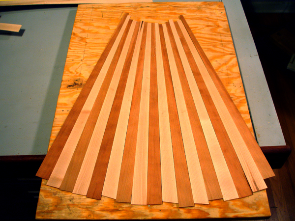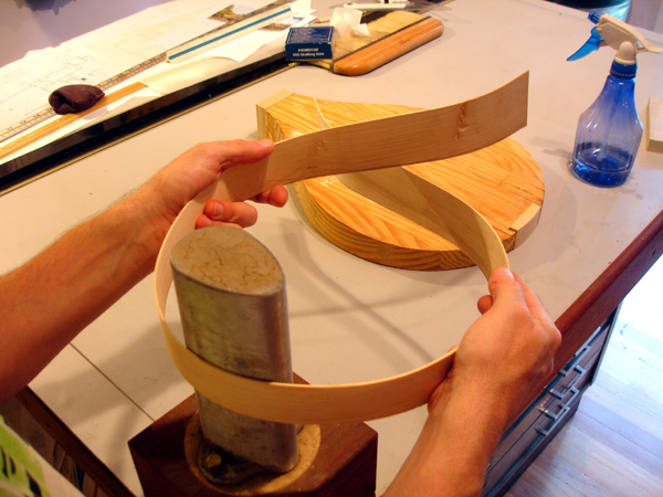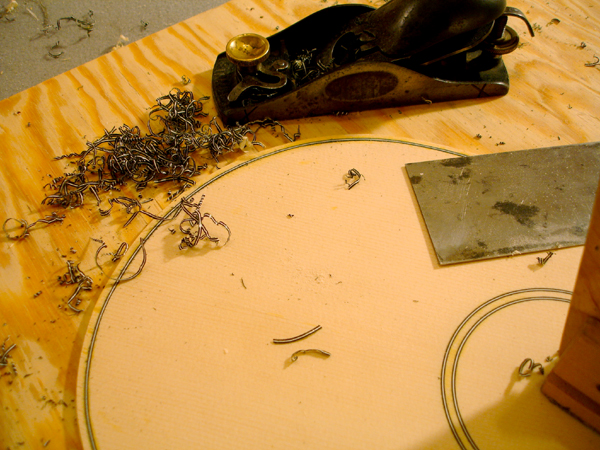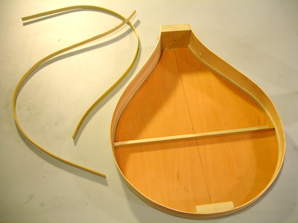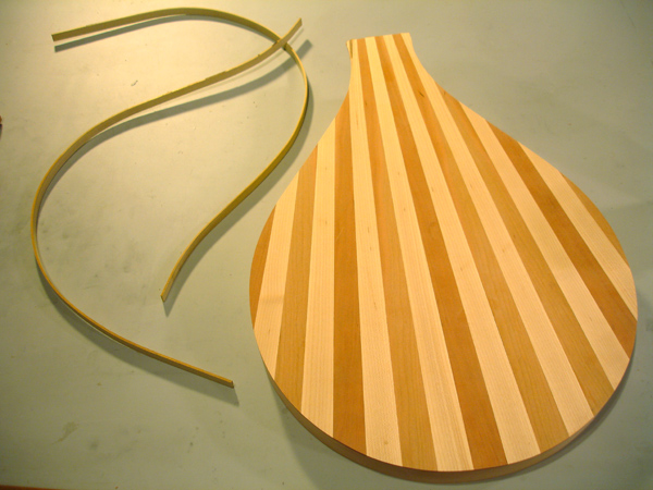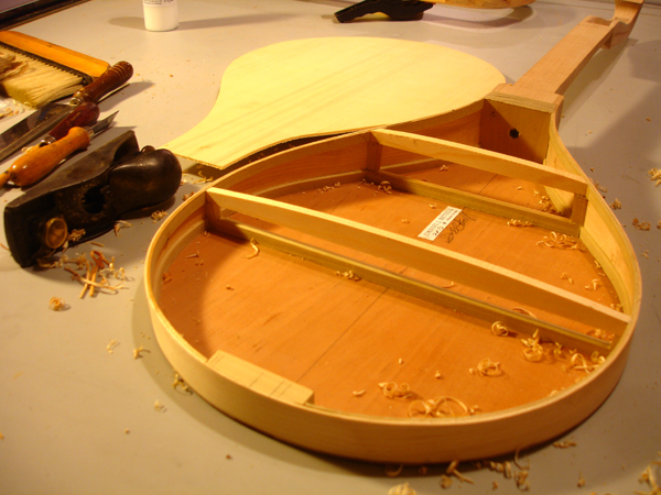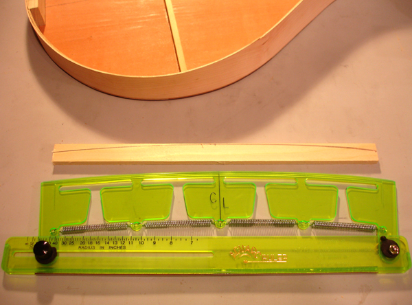 front and behind the fret slot is just right. I have seen some makers - they have been modern reproductions - make the wedge not only tapered but with an undercut dovetail thus taking extra measure not to have the piece fall out. One maker infact used no glue and relied entirely on friction. I am gluing these frets in place so am not taking this extra measure. Here is visible the scribe line I use to set a consitant depth for my first chisel strike on both sides of the fingerboard. Cherry fingerboard for a tenor. After striking each end of the slot it is easily cleaned out with a chisel I have specially ground to the shape of the wedge taper. The finished slots are ready for the fitting of the wedges. Here is the latest crop of DaSalo pegs. This shape is very close to what is currently on the Ashmolean instrument, however I suspect that the pegs, like the fingerboard, are contrivances of the Hills. They are in too pristine a condition and a little too "Renaissance". These are more endearing when they are clean. Turning a scroll cover Attaching the scroll covers Attaching the fingerboard of the tenor cittern. Pegs in the making for the tenor cittern. I've learned to avoid tailstock pressure whenever possible. So I rough turn only between centers then cut the top waste off to hold the head end in a chuck while I turn the shaft, then flip it around to turn the head. Complicated, but less split pegs. Where cittern fretboards come from: a block of Swiss Pearwood. I've finally made a little miter box for my fretwork. The tenor cittern has the top on and the fretgoard is resting in place, fretting in progress. Fret dressing on the cittern in progress. The nearest fret is finished with a domed polish. The next frets still have a bur from leveling. On citterns, the lower the fret , the better the intonation. Especially when the fingerboard is not scalloped. The table spars are attached to the tenor cittern. This is the highest tension I have put on one of these instruments: an octave mandolin tuning in 5ths, so these are some beefy bars. I bought this tool to draw entasis on column shafts for my day job. But it works great for cittern brace arch drawing too Don't cross the streams, Ray! ! ! On a cittern it's possible to have a continuous rib rather than two that's typical on a guitar. The disadvantage is you wind up having to warp it in the process. Which then gets creativly corrected. Venkman, shorten your stream, I don't want my face burned off. Laying up the cherry and maple staves of the back of the tenor cittern. Work on a new tenor cittern commences. I'm making the neck shorter on this one for an octave mandolin tuning. My 'Standard' 61.6cm mensur tenor cittern (top) compared with the shorter version for an octave mandolin tuning +++++ A More Delicate Cittern Following are some project log images of a standard da Salo which I am endoving to make as light as possible, not just weight-wise but visually. The neck has a very slender pegbox and the heel has a mimum of material. The outside shaped, I am carving out the interior. The rib is of perfectly quartersawn hard maple of a thickness slightly less than 2mm. I have rough shaped it prior to bending. Note the block of the body has been drilled out, removing weighty material that contibutes noting to the instrument structurally. The rib being glued to the blocks with form in place. The pieces for the back are being glued up. The lightness of this instrument will be reinforced by the color and simplicity of the materials. I have decided to use pearwood for the secondary wood and fittings. Using the same wood for the back stripes, fingerboard, pegs, etc, will keep the color scheme visually simple, and the value of the Swiss pearwood is not so much of a 'heavy' contrast that would result from ebony or rosewood. The neck is fully carved and temporarily attached to the rib and the back is rough cut, It is so thin - less than 2mm thick - that I will veneer a cross-grain flitch of pearwood veneer to ensure the pieces will not come apart. This is a lighter method than populating the back with many cross braces. Only a couple of thin crossbraces will be needed to prevent back deflection. The linings are on and the rib is attached to the neck The veneer is applied The back is attached to the rib The back is on and trimmed The rough shape of the peg, in pearwood. Refined. . . Finished peg. Splitting the table spars. The yellow edges of this sitka spruce soundboard tell a story. I got this with a cache of other soundboards from Vancouver lutemaker Grant Tomlinson back in 1999. He threw a few of these pre-joined tops in my order 'for free', I presume because they were too small for his intruments and he knew I was in the cittern business. He couldn't remember exactly but he thought they had been prepared for Renaissance guitars. He mentioned he had had them for at least 20 years. So they're well seasoned by now!