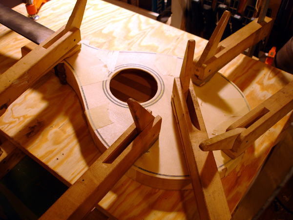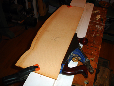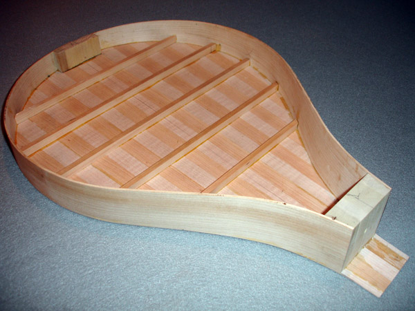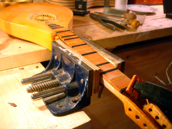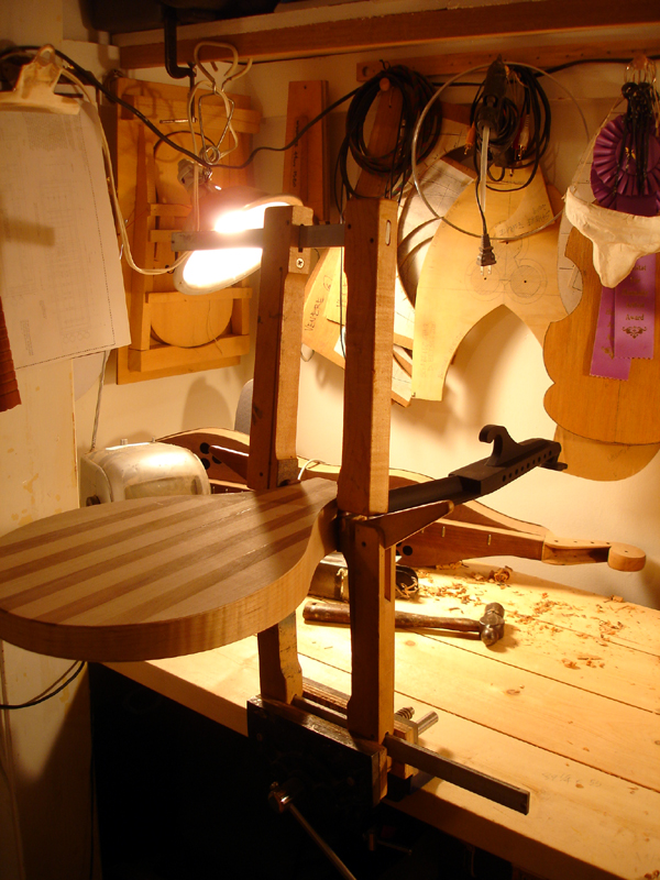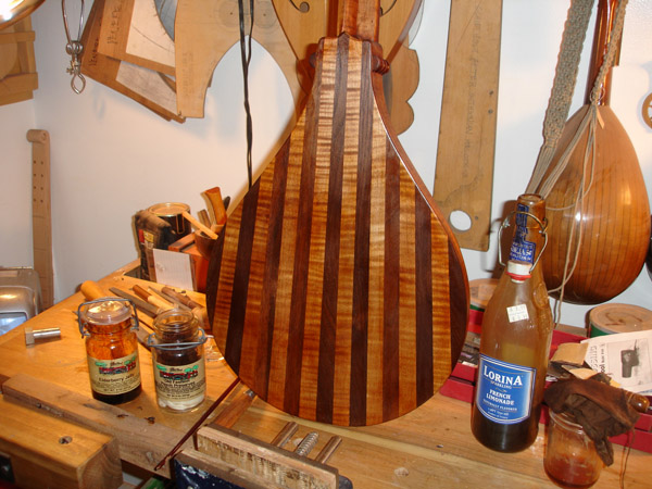 Shooting the soundboard and joining the soundboard for a Tenor. The back braces are in place of a Tenor. This particular instrument is intended for a high-tension tuning so I am employing a greater number of braces both for the top and back. This shot of a more recent tenor cittern body shows my new improved back construction. Instead of lining each stave with cotten strips like a lute construction, or covering the inside back with braces as above, I am laminating a piece of veneer on the inside and using just one limewood brace to keep the back from caving. It's lighter and stronger. No chance of the staves seperating. The only sacrifice is seeing the veneer expressed on the outside of the rib, but. . . . . .putting a dark strip on the outside edges minimizes the effect. Limewood linings await attachment. This is the peg shape I am gravitating towards, here in ebony. It's a simplification of the Ashmolean DaSalo shape. Rough shaping the thumb channel can be done with the router, I have decided. I'm getting some milage out of the painstakingly-made slit drum tuning slot templates. It's just a hair short as you can see. Et volia. Carving the profile against the heel of the pegbox After the profile is made on both ends the bulk can be removed with the bullnose plane. Final carving of the inside of the pegbox General view of the work, finish on the constructed neck DaSalo in progress, neck/pegbox attached to the tenor. The double rosette purfling of the tenor being trimmed Splitting and planing Sitka spruce for the tenor braces. The Tenor fingerboard. The profile is my own shape based on a mid-17th c. Dutch instrument. The fingerboard profile is cut, the leading slot for the fret wedges are cut, the top is attached with the rosette in place. The rosette on this instruemnt is the work of Elena Del Cortivo of Milan. Thanks to the miracle of the internet a Georgia luthier can order a rosette from Milan. However this is the first instrument where I have ever incorporated the work of another - at the request of a customer who wanted a fancier rosette than I was prepared to undertake - and I am undecided about whether I want to allow this sort of thing to continue. I am all too ready to abandon the carved gothic rosettes of my earlier instruments in favor of some type of two-layer design like this, but I must settle on a desireable pattern and a reasonable way of producing it. The lining is glued on. The top edge will be trimmed after the top brace is attached to the soundboard and the exact curve of contact can be determined. Also visible, the linen strips covering the stave seams. The top spars are glued on and are being shaped. The bridge location is located with a pencil mark. This was an experiment with turning the brace grain direction. French polishing. This instrument will have an aged appearance.
