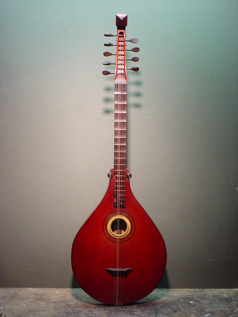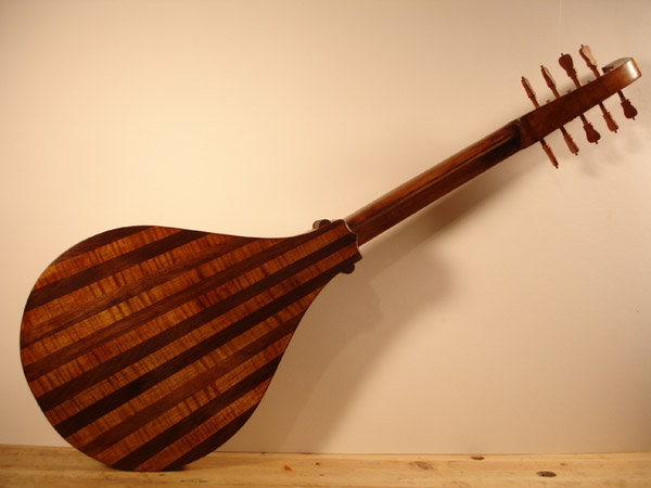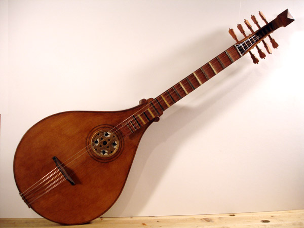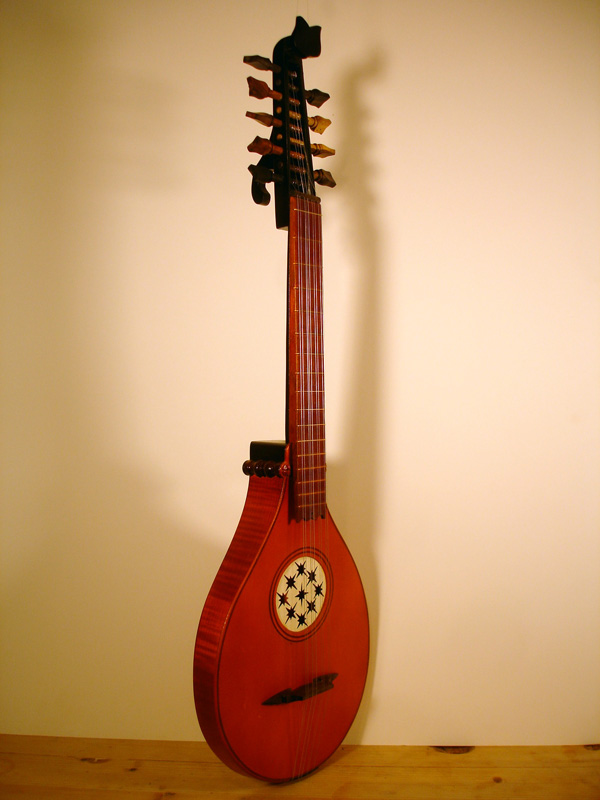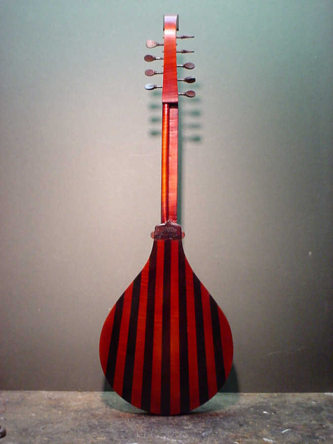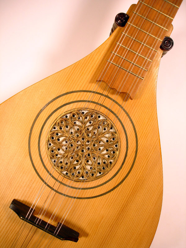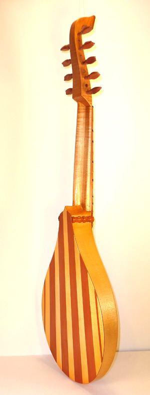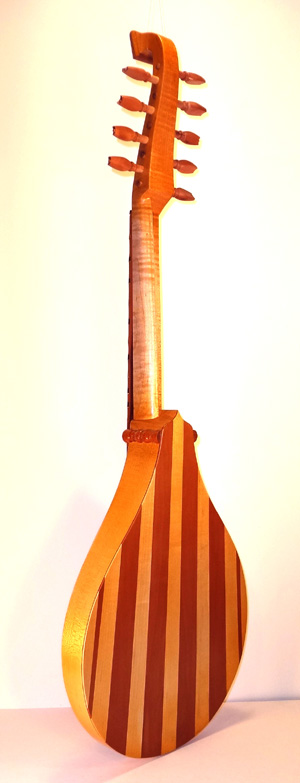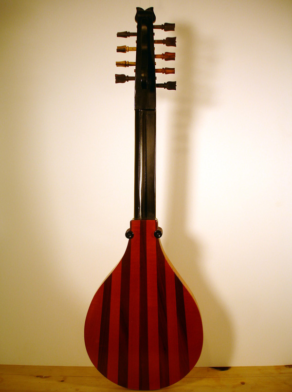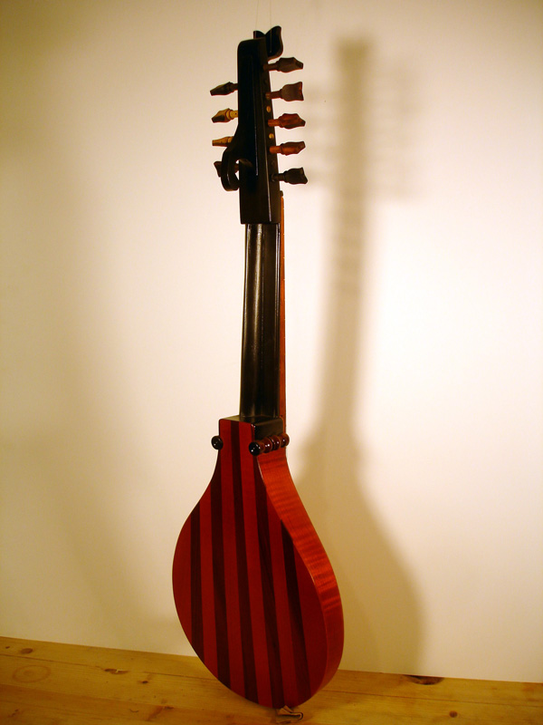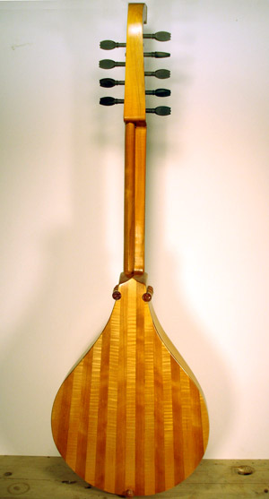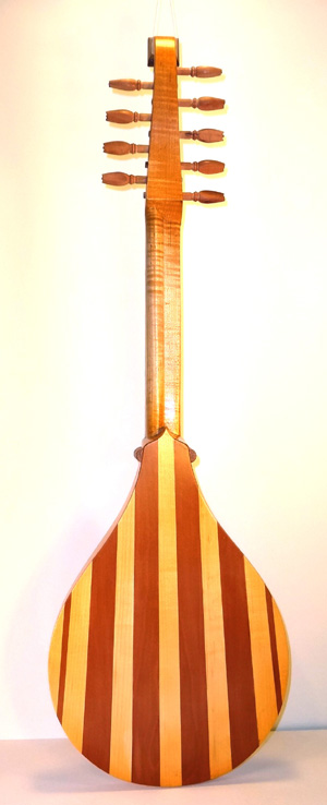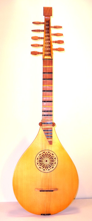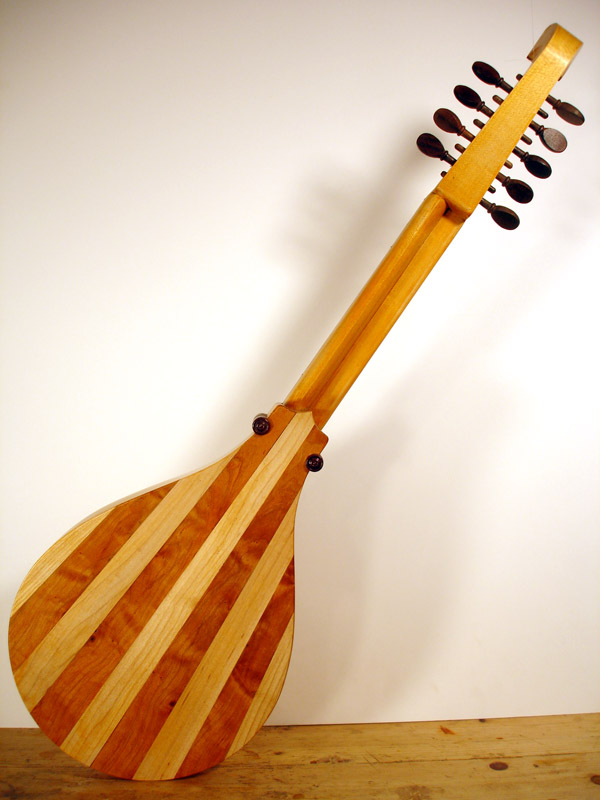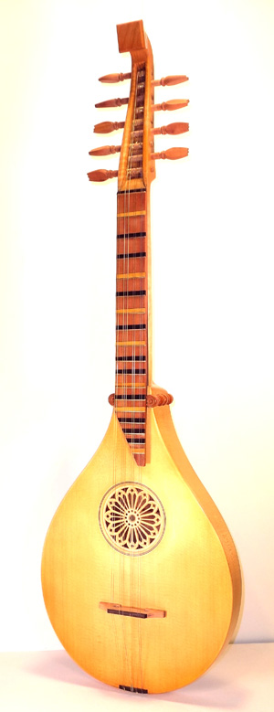 A Tenor Renaissance cittern with striped maple and cherry back, cherry fingerboard with ebony and boxwood fret wedges, ebony pegs and bridge and a 2-layer parchment and pearwood rosette by Elena Del Cortivo of Milan.