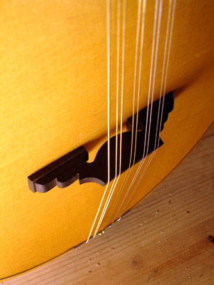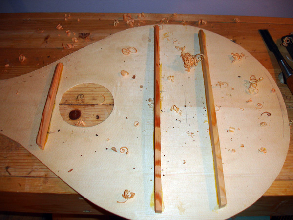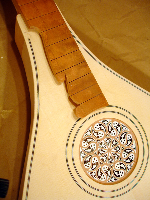 Showing the barring for this instrument. The bar just above the bridge location is stacking with a back spar. The upper back spar centers on the rose location. Due to the thinness of the top, a uniform 2mm, I am adding vertical splints behind the bridge. This top is designed to bend laterally, as with any renaissance cittern, but also crown slightly longitudinally to maintain tension on the top. and help prevent it from collapsing at any point. The rose for this instrument was supplied by a local lute player who has branched into rosette making and based this design on the rose window at the Duomo. The split posts are ready to be glued on. Wire brads with the heads cut off are extra security for attaching the scrolls Cutting the slots for the frets. Gluing in place the fret wedges and drum sanding the fretboard scallops more to come. . . Attaching the nut. The instrument is finished in a tinted french polish with thin protective coat of wax.