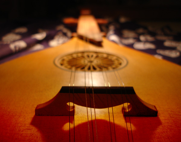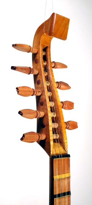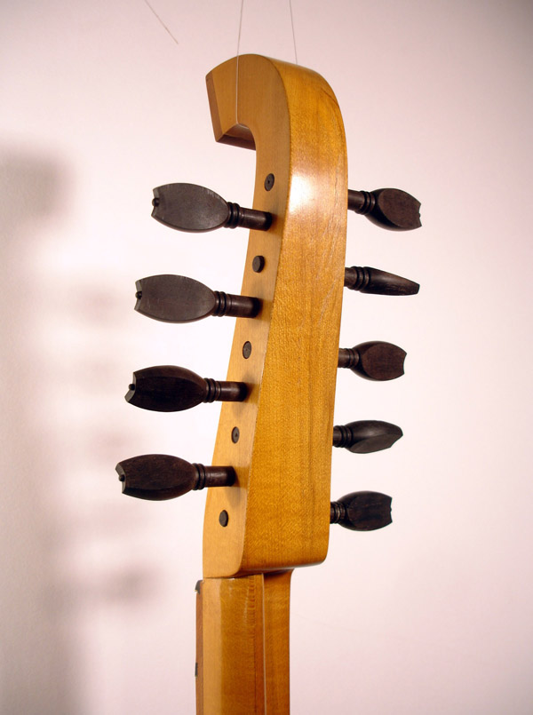 My first tenor cittern with a non-historic rosette. The pegbox of a Tenor model cittern, 61.6cm mensur. I have had some success recently experimenting with different tunings on this instrument. For years I played it tuned just a whole step below the typical 'Italian' tuning - quite high for a tenor size instrument - and it was very loud and plucky and delightfully well intonated, so I left well enough alone! - but in light of some recent inquiries, I have tuned the instrument down a 4th from there to f#-f#/d-d'-d/a-a/b-b, but without changing the strings. Thus taking it down into the range of a modern cittern tuning. I am happy to report that the intonation is not compromised and the sound is still penetrating. To hear samples of the instrument at this tuning click: Example 1 (playing near the bridge) Example 3 (playing closer to the rose) The following is a short video of me playing a hep version of 'Light of Love' in F-C-f-c-f' tuning. If Roger McGuinn played the renaissance cittern I would like to think it would sound something like this: And since the sound is terrible on my little digital camera, here's a sound clip made with actual recording equipment: 'Light of Love' on 5-course F-cC-fF-cc-ff tuning