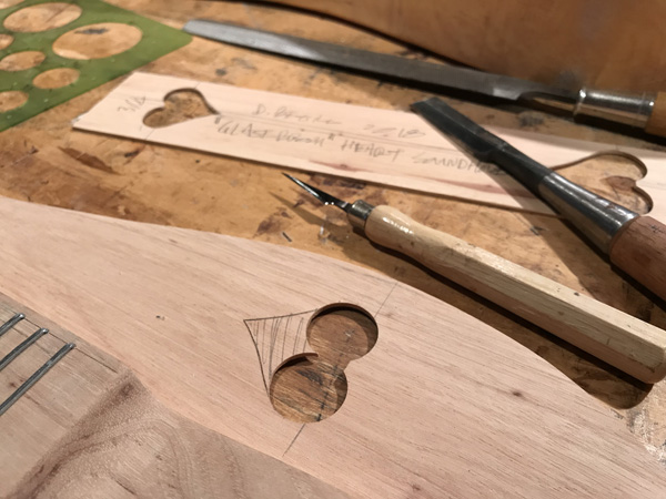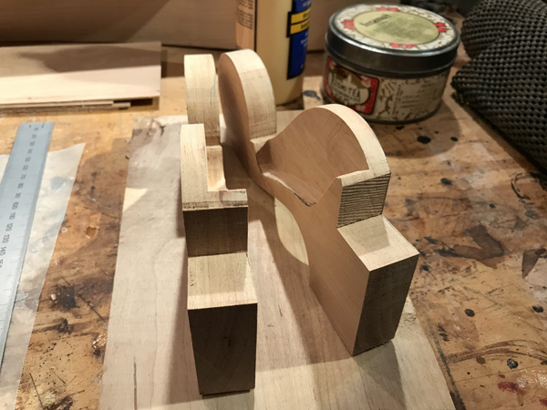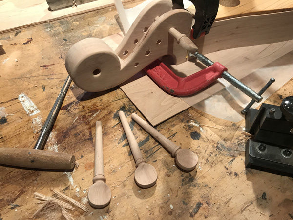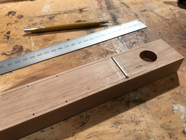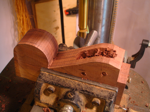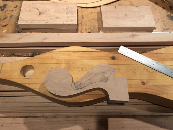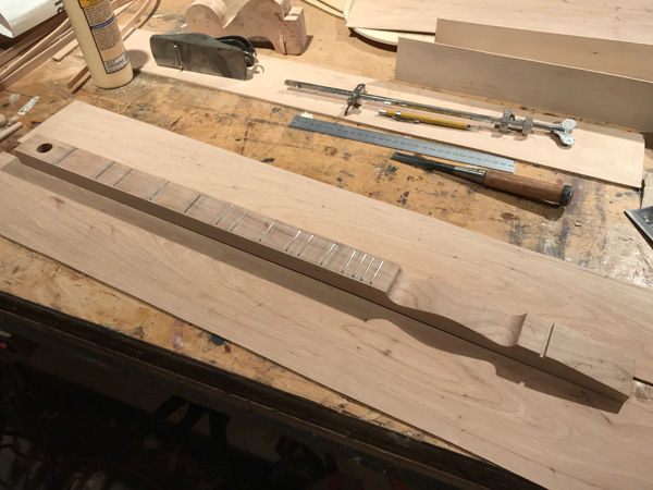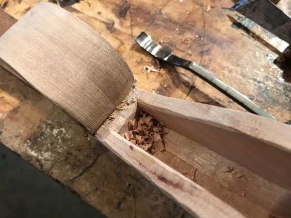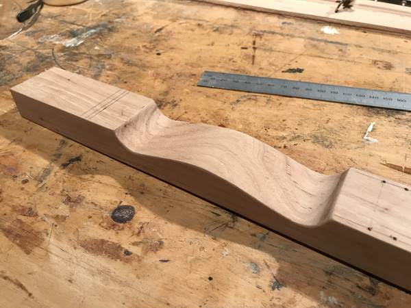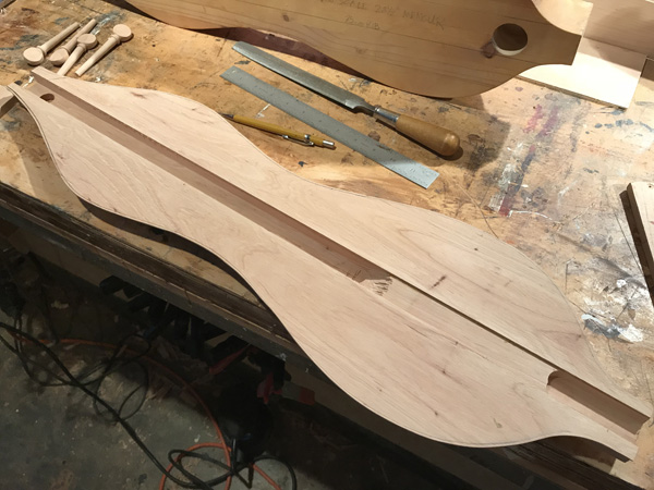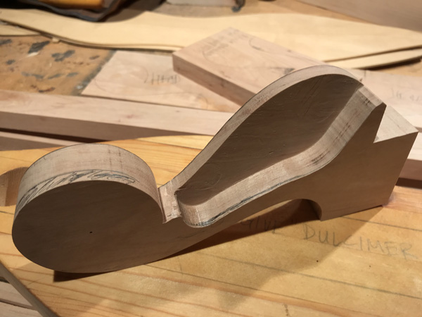 ++++++ The Glasebrook Dulcimer An instrument made on my "deGive" pattern (See here) of pecan wood which I culled from planks bound for a paneled study in a house my firm designed on Sea Island, Georgia A study for the ocean elevation. Pieces cut for the headstock, still showing my pencil "approved" for the millworker making the room. I kept two planks as control samples for the duration of the project. We made a trip to a lumber yard in Kennesaw to select the pieces with the best figure from a stack that was brought from Texas. The house was jsut completed, March 2018. I am doing something new in the way I carve the peghead. Usually in these 19th c. pattern instruments the pegbox is carved from a single, solid piece of wood. But since I am working with planks that are only about an inch thick I have to join two pieces together to get the desired thickness. So I'm taking this opportunity to route out the peg channel before seaming the two pieces together. With the piece turned upside down on the router I'm shaping out the channel "blind" as it were. Constantly checking to see how close I am to my pencil shape. Since the peghead is tapered but the cheeks want to remain a consistant thickness I am removing material on the inside seam before joining the two halves. With the tapering complete. One down 3 to go. General view of the work including a Hummel-shaped dulcimer I'm making out of maple. My guitar project nearby stands ignored. The ribs are bent and dry fit to the form with an end block. I'm making two identical instruments Gluing up the two halves of the pegbox Dry fitting the pegbox and ribs and starting to look at the fingerboard blank Cleaning up the routed channel and easing the edges of the cheeks The pegs are turned. I'm making the entire instrument out of the same plank. Peg heads shaped and fitting to the headstock Fitting the liners As on the deGive dulcimer I'm making the frets out of fence post staples, a common implement found on the pre-revival instruments. As before, I am having to pound them out to make the face slightly longer for my wider fingerboard. I have always liked the addition of a drilled hole at the top of the fingerboard of "Virginia pattern" instruments so I'm adding this detail for the first time. Even though my "deGive" pattern is closest to a West Virginia shape. The strum hollow shaped as the deGive instrument. But this shape as well as the peghead scroll is a nod back to features in the house design. The ribbon of the fronton over the Loggia entry. . . Only after the frets are in place do I route out the channel on the back of the fingerboard. First with sucessive cuts on the tablesaw, then with the router. The fingerboard is complete The top pieces are rough-cut and attached to the fingerboard I'll cut the soundholes after the top is assembled so the positioning can be aesthetically correct I use a knife to slice out the shape after drilling. Splines attached at the underside, very inportant to keep the top from splitting around the holes The finish is two coats of button shellac and a healthy topcoat of beeswax. My second instrument is lagging behind! Completed image, with a cittern and the first deGive dulcimer on the left, made out of heart pine. ++++++