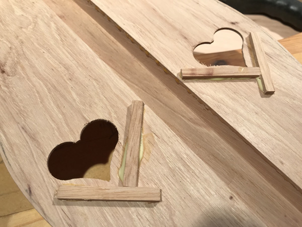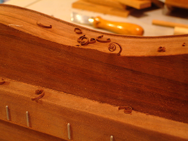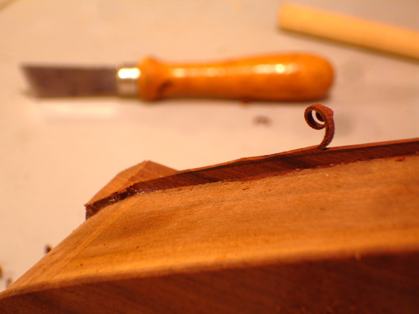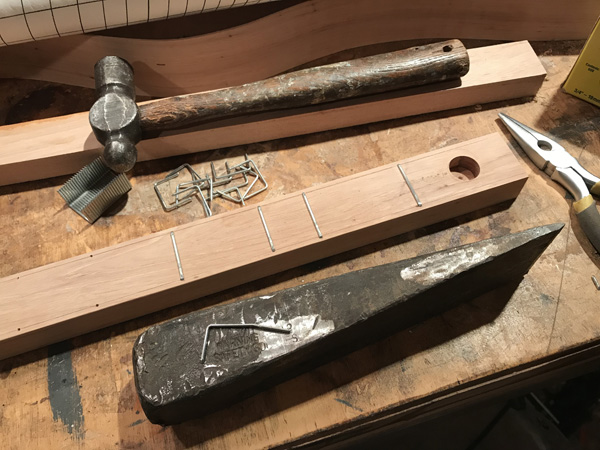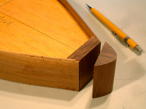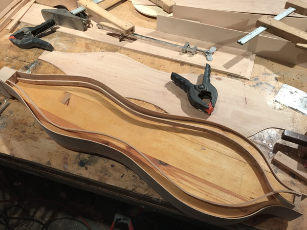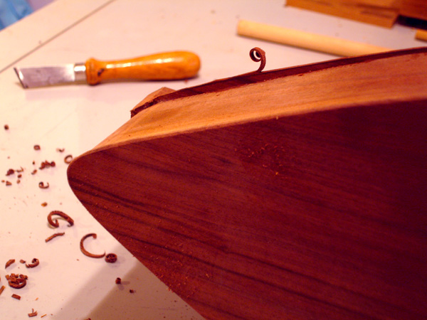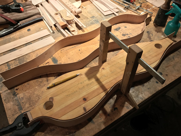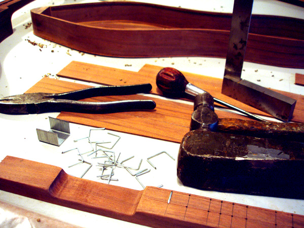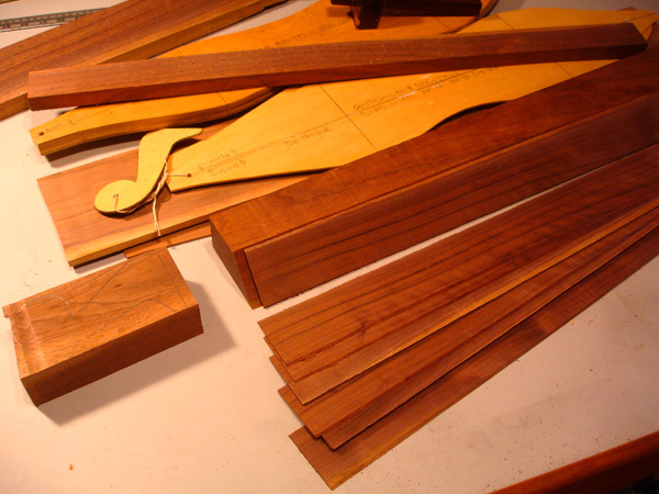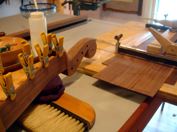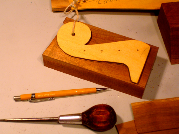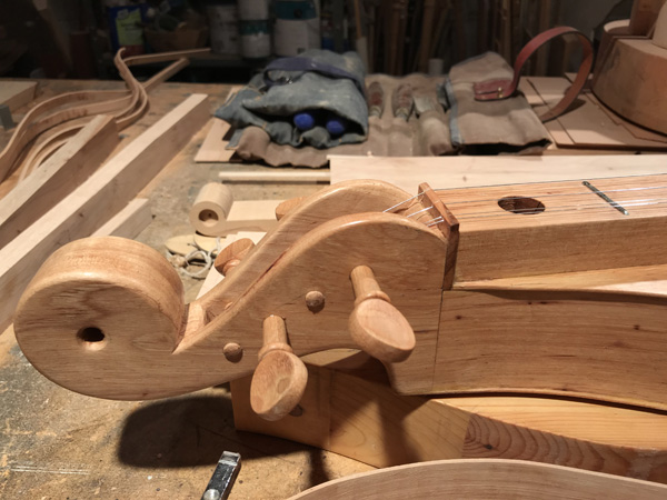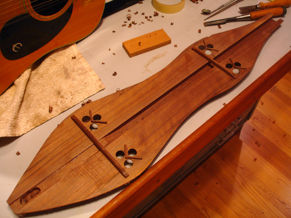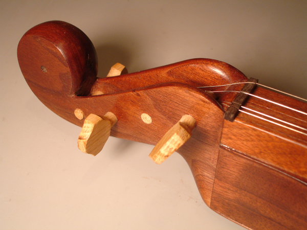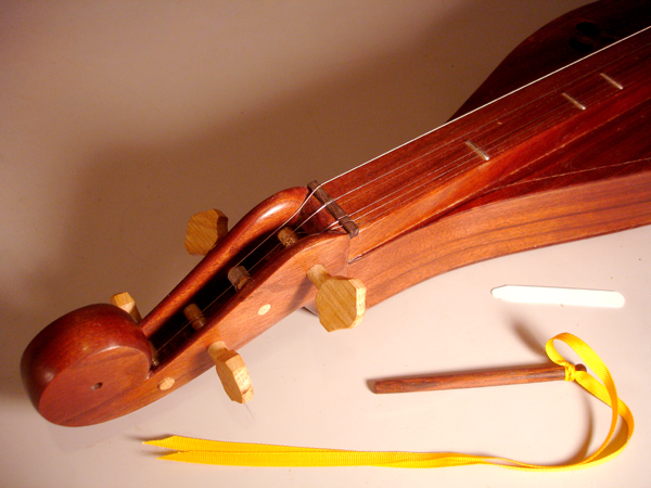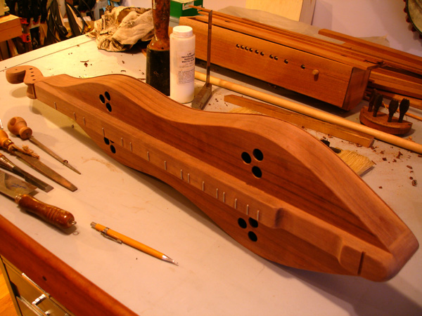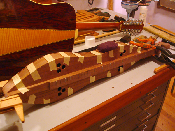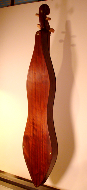 The Hammack Dulcimer This page is dedicated to my reproduction of a dulcimer in the Smithsonian collection which I documented in 1998. Accession #65.0175, the instrument is believed to have been owned by the Confederate cavalryman Charles Hammack, dated between 1848-1885. In walnut with painted black purfling and beveled, overlapping edges. A beautiful shape, it was the standout of the collection of 10+ instruments which I drew and photographed. Staple frets lying only under the first double course. A contact sheet of some of my study images. The slab of walnut I had was far from quartersawn, so slicing the sides at a true quarter on the bandsaw was a challenge. The pieces in the front have been drum sanded to just over 2mm thickness. The block to the left will be the headstock. The pegbox template Drilling out the pegbox after the peg holes have been drilled but before the sides are tapered. Two operations going on here: the liners are being glued to the rib and the pieces for the back are being joined. I am using walnut for all the secondary parts of the instrument. This will be an entirely walnut instrument. The rural makers of the earliest dulcimers instinctively used a single wood throughout, except for the purpose of aesthetics. I used to attach the ribs to one single block at the tail, with the appropriate rebates, but as I've made more of this model I find it easier to attach them to an 'internal' block, level the face, then scab on a 'cap block'. Who knows how the original was made - unless we x-ray it - but I think this pragmatic development is in the spirit of the early makers. Putting in the staple frets. I found these industrial staples that approximate the weight of the originals but they're the wrong width for an instrument that just has frets under the first course of strings. So I'm pounding them out and reshaping them. Pencil lines show the pre-drill locations and will be sanded out, but the scribe lines to mark the rows of holes along the length will remain to show the maker's hand. I put small cleats between the soundholes to prevent splitting and spars under the sets to prevent soundboard collapse. I doubt the original had either one of these precautions, which makes it amazing that after 150 years there is no damage to the top. This view also shows a hollow drilled out under the bridge location. Most of the earliest dulcimers had solid sticks for the raised fingerboard. I was unable to get inside the original, but it is a very light instrument and I believe it is possible that the fingerboard is in fact hollowed. Taping the top down. Trimming the top. I could do this with a router bit but it's mroe fun by hand. I tend to take pictures of the operations i enjoy the most. The top is trimmed. The nut and bridge slots are cut. The next step is making the pegs. The instrument has unusual cross-shaped pegs in oak, which I have not seen on any other instrument. Scratching in a purfling line. The original has black paint on the edges but this version will have only a line scribed to represent the original treatment. I have seen this detail on many 19th c. dulcimers. The makers echoing the inlaid pufrling they had seen on violins. ++++++ Completed images: