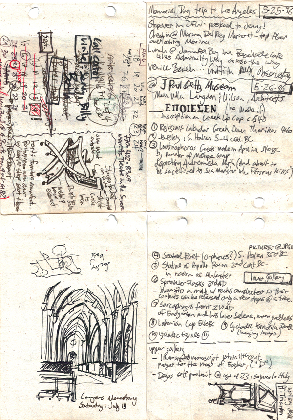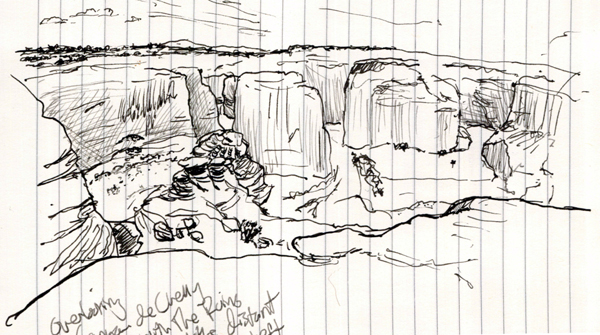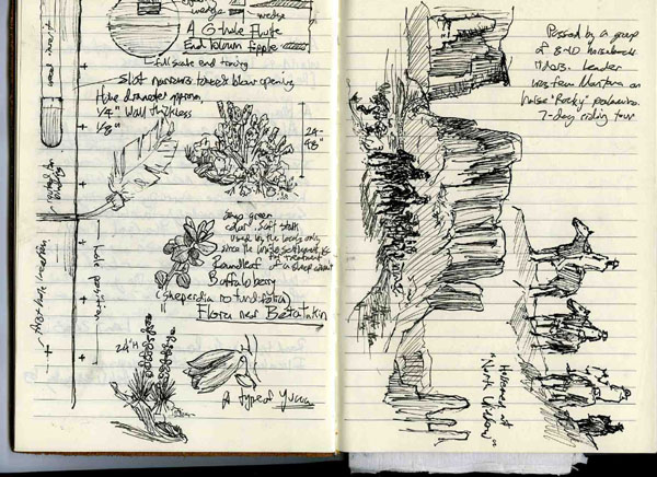 You're not much of an artist if you don't keep a sketchbook. I have had several over the years. The present one succeeded my much traveled, self-fabricated aluminum-covered flip-style book, a mere 4x6 inches. The present leather-bound book, a gift from my mother from Blackberry Farm in Tennessee, has been to the desert of Arizona, the sun-bleached monuments of Sicily, the streets of Charleston, and around the coastal islands of Georgia. It is my constant companion and holds many of my primordial instrument designs, songs, nature observations and is in effect my 'chap book', containing in longhand my most cherished prose and quotes. Following are a few select entries. Organizing this page is an ongoing exercise, so bear with the not-yet-rotated images. Just getting them scanned and up here was enough of a task. Most of the excerpts are presented 'in situ' in a book spread, but I have started to pull out and isolate some of my favorites, presented here at the top. Enjoy. I'll never forget sitting cross-legged on the edge of this huge panorama of Canyon de Chelly. This view was especially meaningful at the end of a day tromping around the basin.