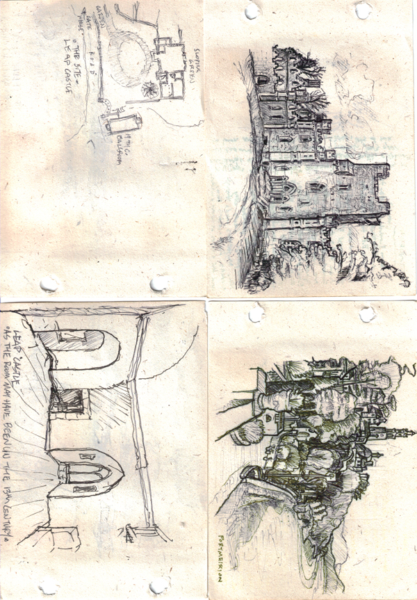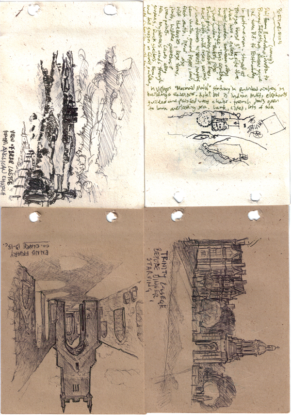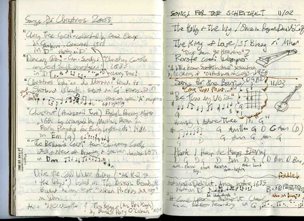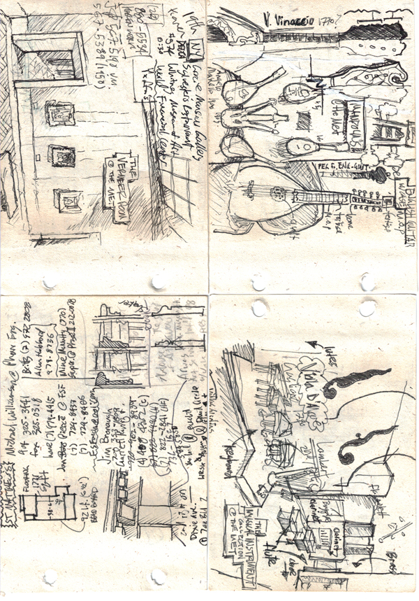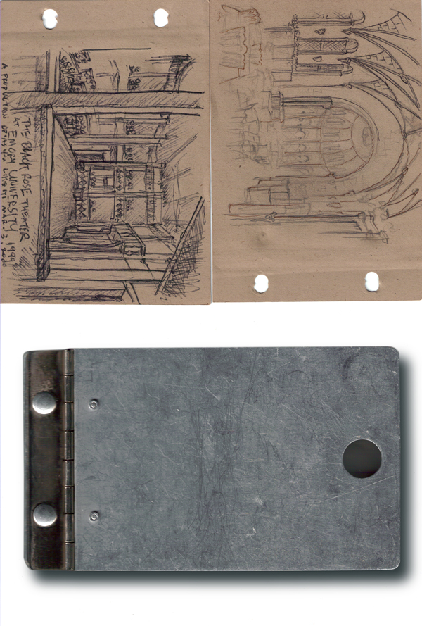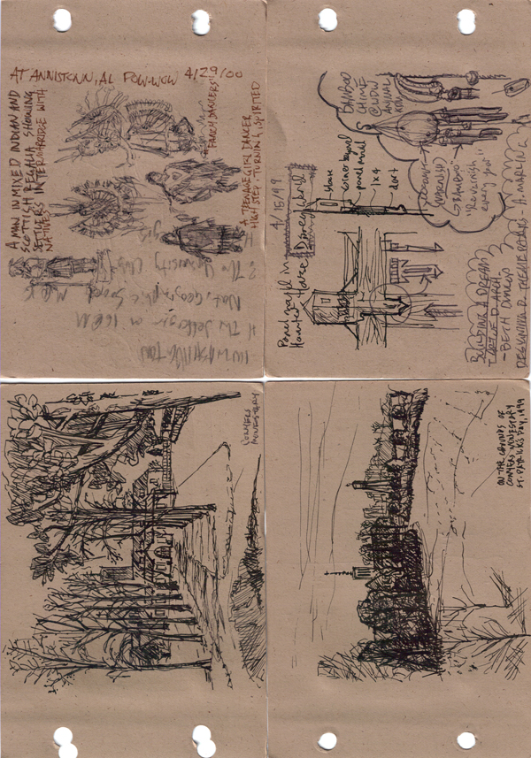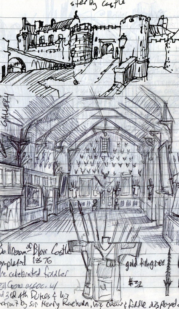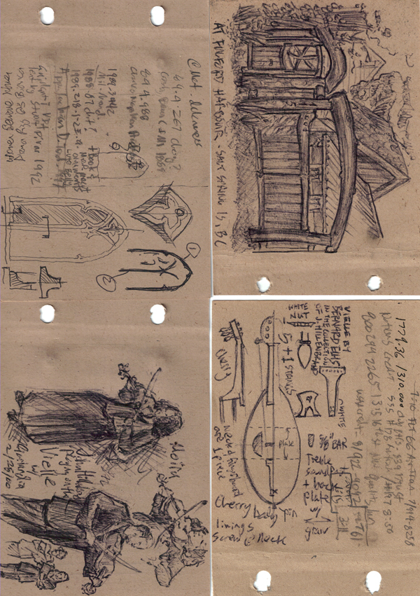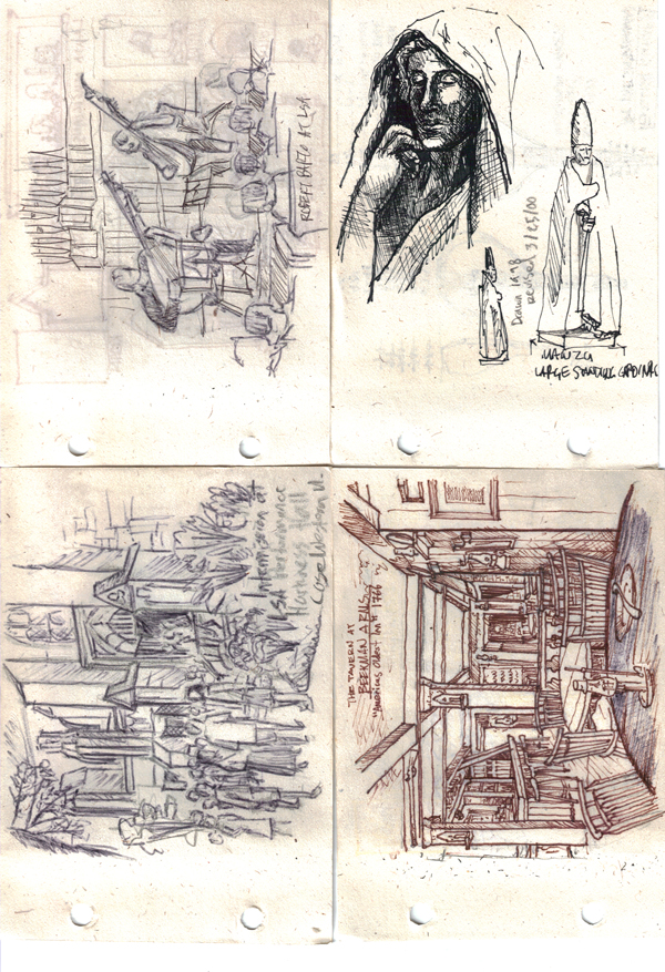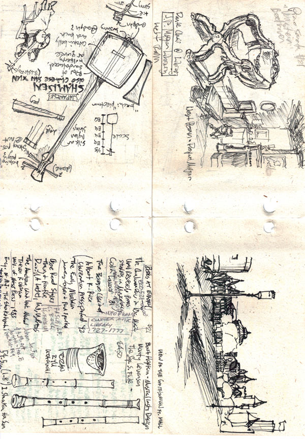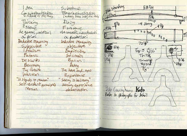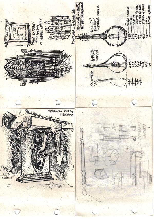 I am keeping a running list of philosophical arguments I encounter which fit the Idea/Substance model. 'Know thyself!' I defiantly fall on the 'a posteriori' side. Also a casual documentation of a koto with full-size tracings of the bridges. From a trip to Charleston with my cousin Steve. I sketched while he photographed. I was reading 'The Tale of Genji' for the biwa commission at the time. From the 2005 trip to scotland marching with the Atholl Highlanders of Stone Mountain. The sketch in the pub of our traveling companions, Pam and Evan Kohler-Camp and Angie and Ron (sitting out of frame). We were lunching before seeing Roslyn Chapel, pictured with scaffolding below left. +++++ This little self-fabricated metal sketchbook suited my needs for a good 10 years and was made to be easily disassembled so new pages could be added. I revisited it recently and scanned some of the choice pages which were contained in its retired condition.