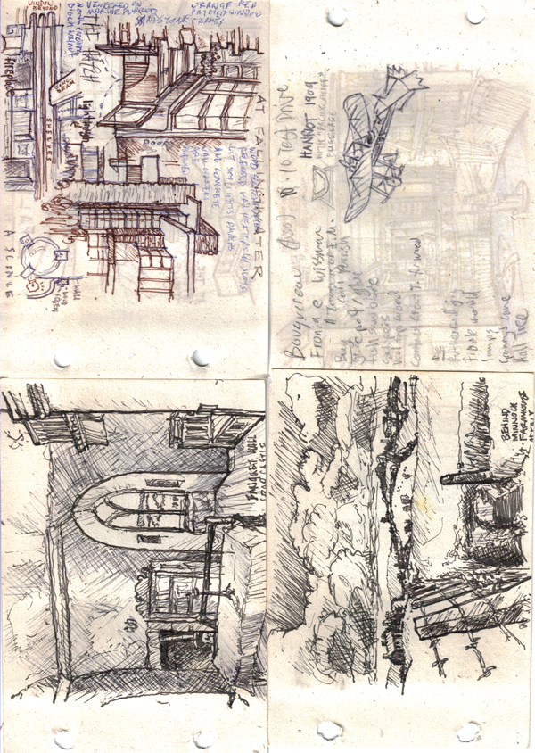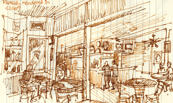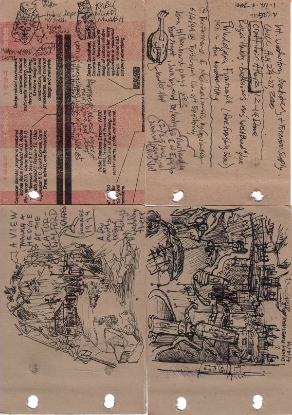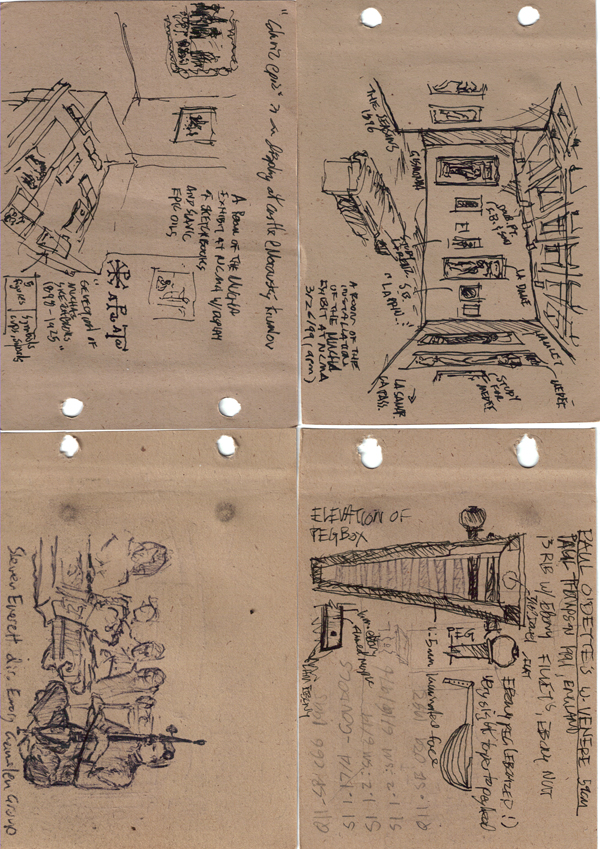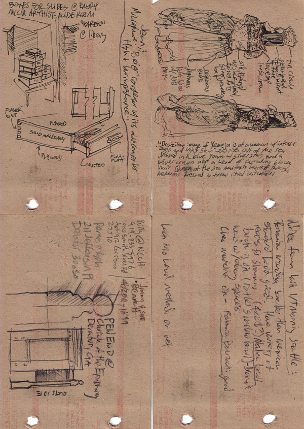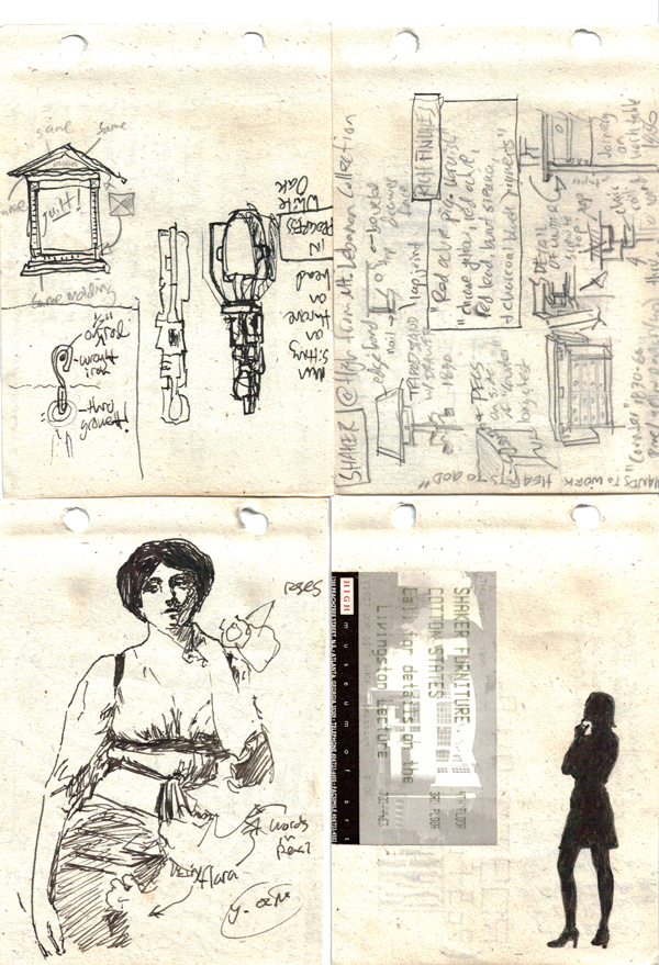 An unfinished inking of the member's dining room at the Smithsonian The exterior of the book. My visit to the Shaker exhibit at the High Museum. And some miscellaneous art seen while there. The sillouete, if I remember correctly, is from an American Express ad of some woman looking at art. A woodblock i made to print postcards on cardboard boxes for mailing, various furniture I'd seen and liked, a demonstration I went to at the High Museum of a traditional African mask maker. A sketch of a coastal scene with knotted trees blown back by the wind, possibly on St. Simon's island. Notes from the Pre-Raphaelite exhibit at the High. Study sketches of the reception desk at the Atlanta History Center.