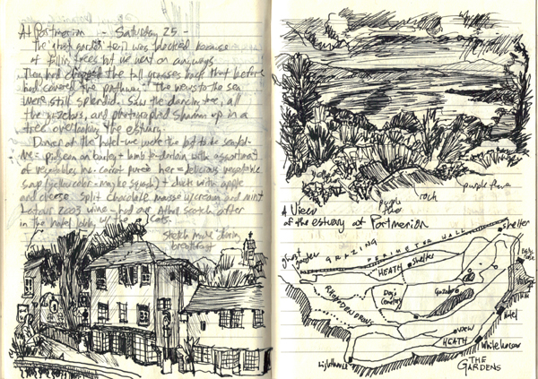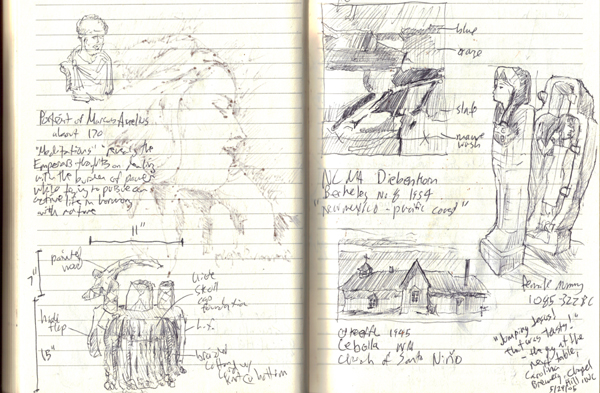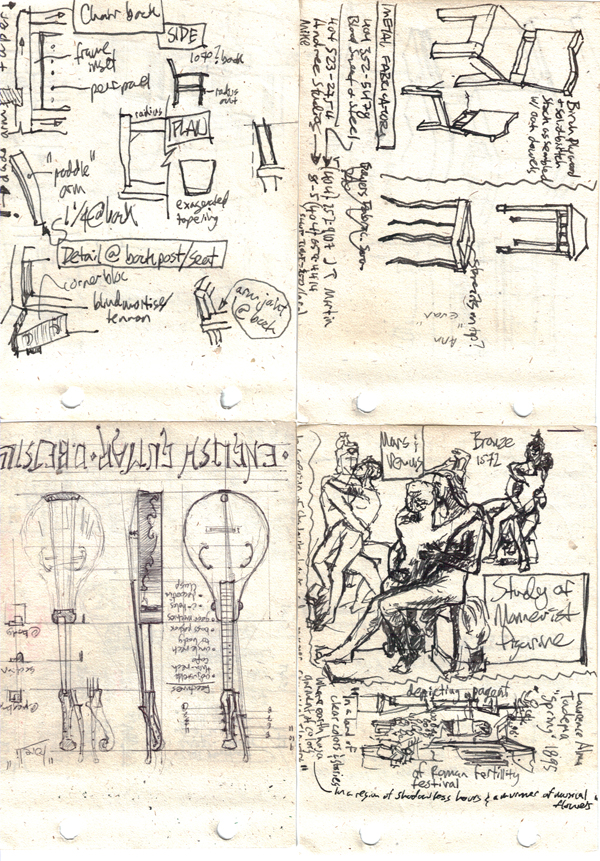 (right) A wooden sculpture in the High Museum and a Japanese planing beam, with an interesting quote from whatever source I was seeing: 'Whenever the Japanese workman can leave a bit of Nature in this way he is delighted to so. He is sure to avail himself of all curious features in wood", referring to the 'wane' edge left on the piece. (left) I'll never forget my up-close meetig with Ramses before he was shipped from Emory back to Egypt in 2003. Sketches from my favorite place on earth: Portmeirion, Wales. Lessons to be learned on architecture, lessons to be learned on life. I will turn the book whichever direction is most supporting for my hand. A favorite spread I did while at the North Carolina Museum of Art in Raleigh. They have it all. Sometimes inspiration comes when I do not have my sketchbook with me and whatever scrap that is on hand will get pasted into the book. Here is a napkin on which I sketched some scheitholt designs. And a chipmunk.
