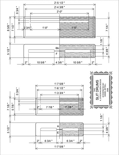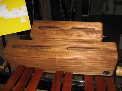 Stockhausen Slit Drum On the heels of the Heaven's Door commission, Stuart has commissioned these instruments to perform Stockhausen's "Zyklus" and "Kontakte". I am building these out of the same quarter sawn sapele that was used for the Heaven's Door plates. The instruments manufactured by Kolberg Percussion GmbH, Uhingen, Germany are tooled on their outer surface to resemble natural log graining, no doubt contributory to their inflated cost. We are not reproducing this effect. Below are some study photos taken by Stuart of the Kolberg instruments