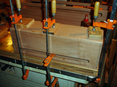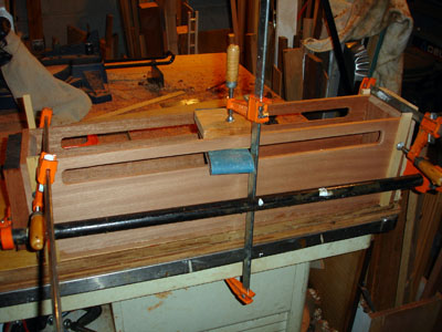 Inside view of a typical end with the interior liner block angled back so as not to contact the top. Only the thin rebated edge contacts the underside of the top. The rebate creates a continuous edge to separate the top from the carcass. This will be a hide-glue joint to make disassembly of the top easier. ++++++