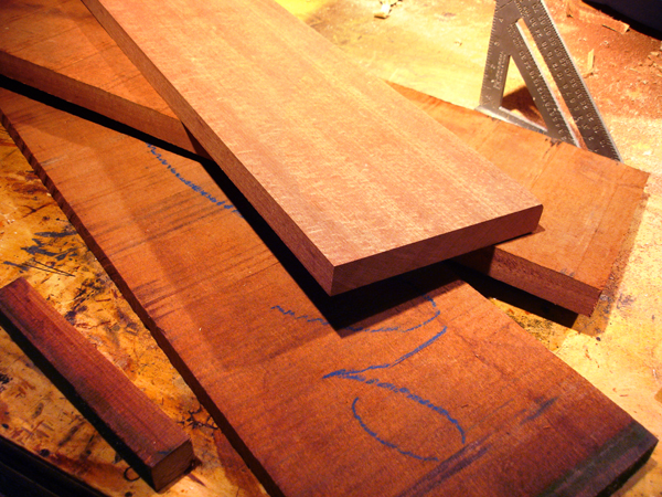 The beginnings of a set of Stockhausen slit drums: planks of 4/4 sapele. The top board is planed. Bring it HOME.