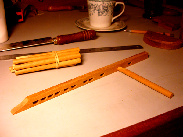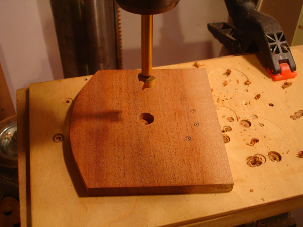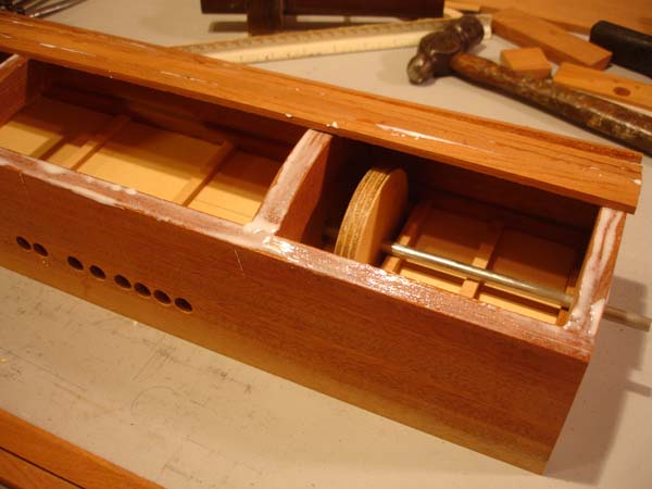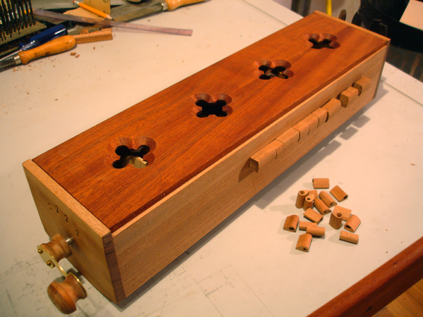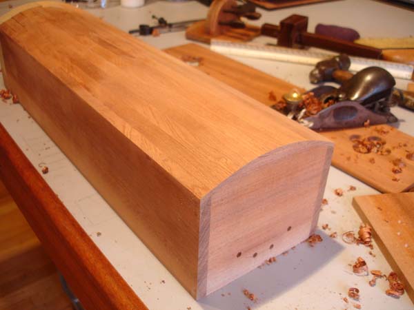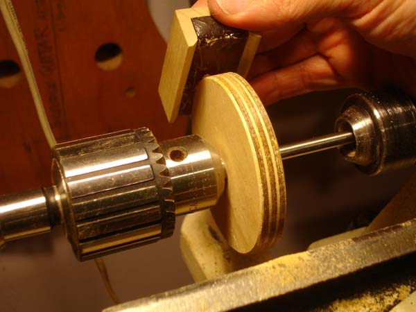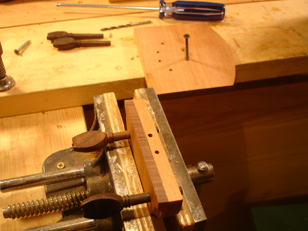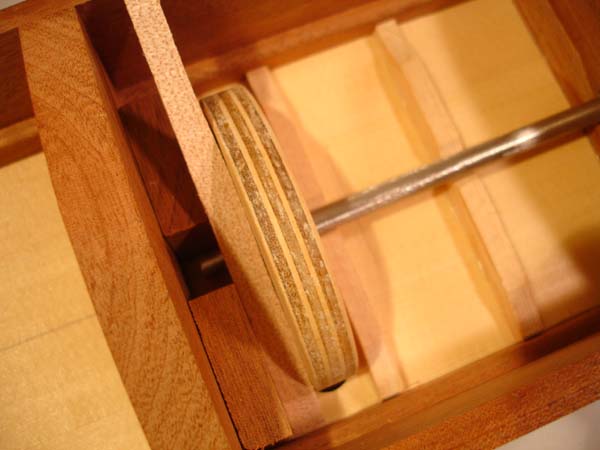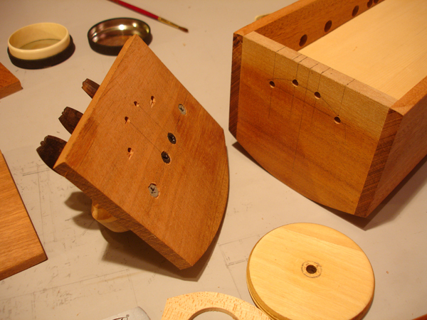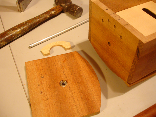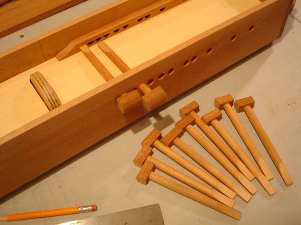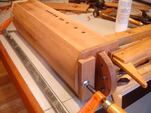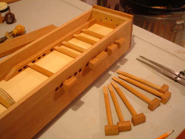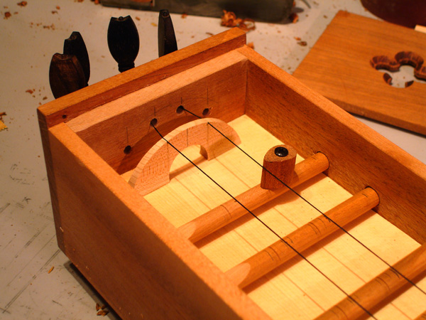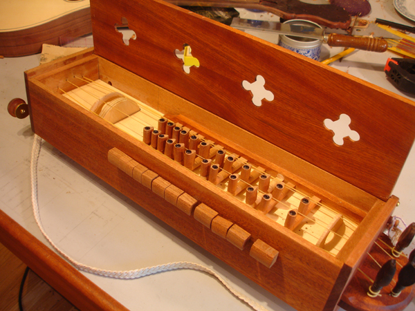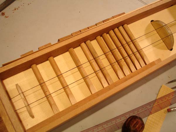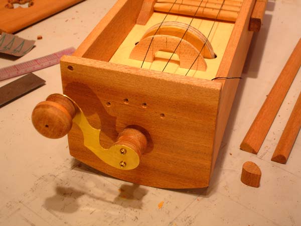 A Symphonia or Chifonie From the Luttrell Psalter, English, 14th c. My drawing based on the David Kronberg design. My version has both bridges resting on a common soundboard, a peg disc and the strings extending the full length of the cabinet. I also modified the key design, favoring dowels rather than square sticks. Parts in progress. This is a dry fit of the carriage. The top and soundboard are cut in the foreground. An end cap and the untapped bulkhead for the internal bearing are to the left. Gluing the soundboard linings to the inside of the carriage. The holes for the keys had to be tapped before assembly. This is my main improvement over the source design. The keys for that instrument were square and therefore required square holes to be tapped into the carriage. Besides square holes being much harder to tap than just drilling out round ones they create a greater splitting potential. The advantage that square holes have is keeping the keys upright. My keys would spin if I didn't flatten the reciver end of the key and create half-holes at the reviever bank. The underside of the soundboard showing the brace locations. Also the key blanks layed out in the reciever. The reciever assembly. With delicate curved termination. The Kronberg design uses phrenolic for the wheel, which is good for ensuring stability but I can't bring myself to put space-age polymers in a medieval instrument. This is not exactly antique, but at least this plywood is wood, and more stable than solid wood, which no matter how dense is still prone to irregular shrinkage that will affect the consistency of stroke on the strings. This is a precious scrap of 'Paraply', which was available from Home Depot in the 1990's in 4x8 sheets. I used to make modern-looking furniture out of it. The sustainability police has since closed the borders on this stuff. But for what I have left it is the most dense, dimensionally stable plywood I could hope to find. I'm sawing it to thickness here before I turn it on the lathe. Drilling the bearing seat hole and holes for the strings to pass through the end cap Flipping it around to drill through the hole for the shaft to pass through and small coves for the knotted ends of strings to set. The bearing in place, this face will be glued to the end of the carriage. I'm counting on this bearing never needing to be replaced. A dry fit of the shaft in place through both bearings. Starting to tap holes for attaching the peg disc to the end cap. From the land of over-engineering. The peg disc will never ever come off. Dry fitting the peg assembly end. This is hair from my aunt's horse she sent me many years ago for a bow I was going to make. Not quite sure how I'm going to do this. . . .OK, the horsehair idea proved untennable. Also did the hollow aluminum shaft I got from the local hardware store hobby section. So here is a new wheel that will simply be rosined (in progress on the lathe) and a new solid stainless steel rod that will make a much better. . . SHAFT! You see this cat Shaft is a bad mother. . .Shut your mouth! . .But I'm talkin' about Shaft. . .Then we can dig it. Right on. So anyway, stainless steel. . .much better. I've reduced it minutely on the belt sander so it slips into the internal bushing with minimal pounding (having to pound something into place on a musical instrument feels wrong) and creates some tooth for the wheel to grab. I'll probably still have to use a set screw. Here I've put some blocks in place as I tap the shaft through the wheel. It is with this step that I'm realizing the wisdom of the Kronberg design. What it lacks acoustically due to the lower bridge resting not on the soundboard but the back is gain by having the wheel completely accessible after construction. When I put the back on this instrument it will be very hard to ever get the wheel out. I have to install the wheel somewhat early in the build to make life easier on myself in assembling the staves of the back. With the end caps off I can easily profile the finished stave glue-up on the belt sander and easily trim the ends flush with the carcus. Kiss that wheel goodbye. Did they have masking tape in the Middle Ages? Progress shot of sanding the staves flush with the end and rounding off on the bench sander. Attaching one of the end caps. It will then be flushed on three edges on the bench sander. Starting to make the keys. The blank for the keys is drilled out and shaped on the back, then cut to equal lengths. Don't forget to make sure they're square before the glue sets. i almost did. Since the keys are different distances apart, the heads will be cut to length individually as each key is matched to a specific reciever. Each key has its own reviever now and the tips of the shafts are being trimmed to seat the key sung in each slot. Any wobbling will effect the intonation. After seating each key the heads are trimmed to slip smoothly past one another. The closeness of the heads will also help keep them square upright. I'm compensating for not having those square holes of the original design. After the heads are trimmed a shim is used to hold them out to the 'open' position while the shafts are marked in three places for holes to be tapped for the stop and the two frets. The first key has set holes tapped for the frets. Starting to make the frets. Also showing here the simple bridge design The knob and spacer are turned and I've sketched out the crank arm on brass sheet for cutting out with the jeweler's saw. Crank temporarily attached. I think it's just going to fit on the shaft end with friction without needing a set screw, but i don't want to tap it into place yet. Taking a break from fret making, the quadrafoils in the lid get cleaned up with a sanding cone. The router bit I used to shape these wasn't quite sharp so it left burns that I'm sanding out by using a turned cone that matches the router bit angle. Tedious drilling proceedure: I've made a little rebate seat for the frets to sit in for 