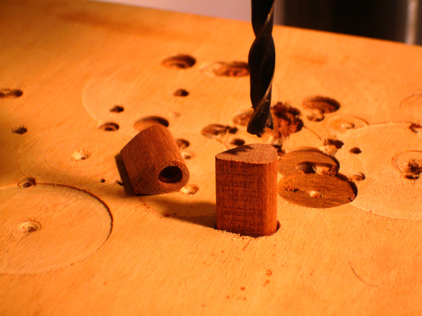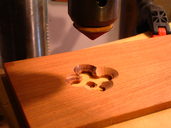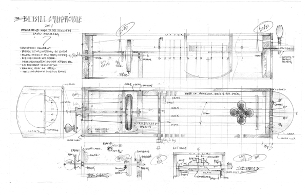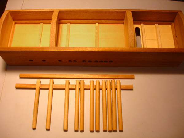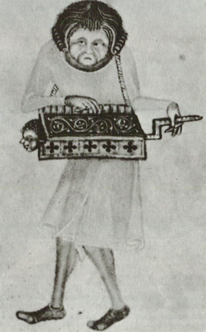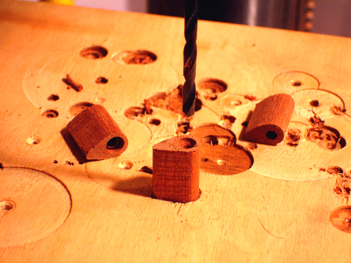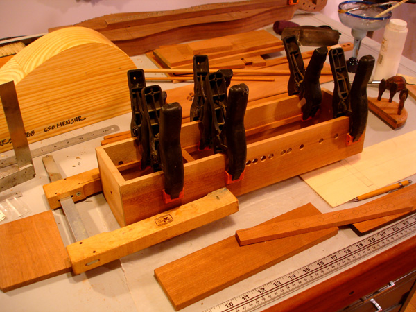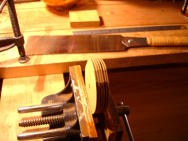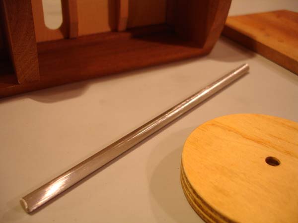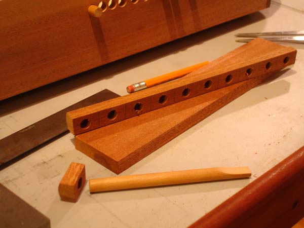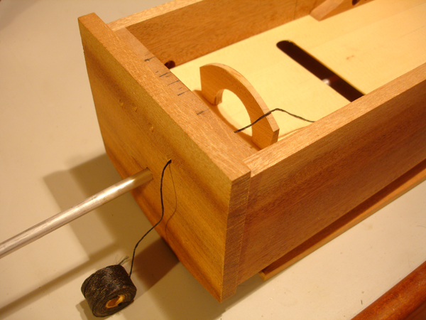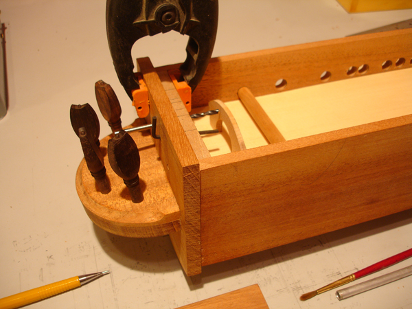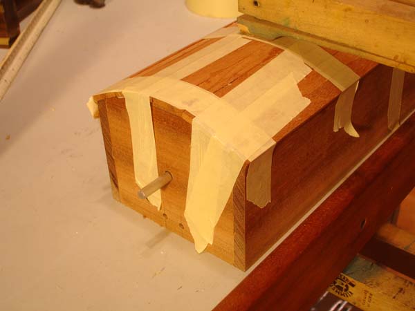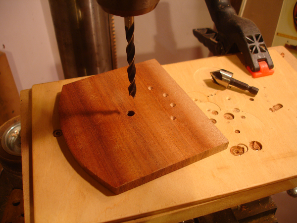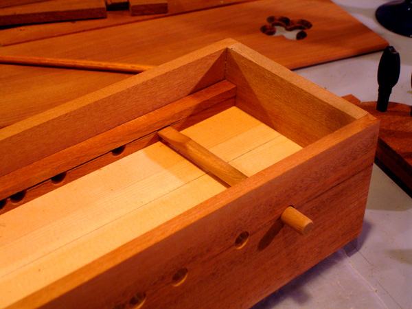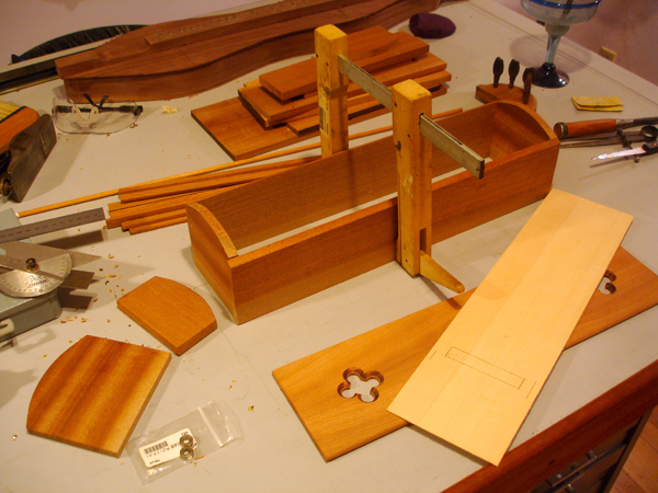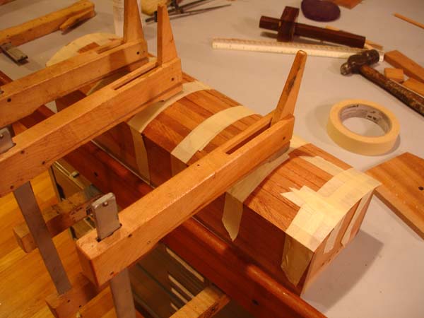 A Symphonia or Chifonie From the Luttrell Psalter, English, 14th c. My drawing based on the David Kronberg design. My version has both bridges resting on a common soundboard, a peg disc and the strings extending the full length of the cabinet. I also modified the key design, favoring dowels rather than square sticks. Parts in progress. This is a dry fit of the carriage. The top and soundboard are cut in the foreground. An end cap and the untapped bulkhead for the internal bearing are to the left. Gluing the soundboard linings to the inside of the carriage. The holes for the keys had to be tapped before assembly. This is my main improvement over the source design. The keys for that instrument were square and therefore required square holes to be tapped into the carriage. Besides square holes being much harder to tap than just drilling out round ones they create a greater splitting potential. The advantage that square holes have is keeping the keys upright. My keys would spin if I didn't flatten the reciver end of the key and create half-holes at the reviever bank. The underside of the soundboard showing the brace locations. Also the key blanks layed out in the reciever. The reciever assembly. With delicate curved termination. The Kronberg design uses phrenolic for the wheel, which is good for ensuring stability but I can't bring myself to put space-age polymers in a medieval instrument. This is not exactly antique, but at least this plywood is wood, and more stable than solid wood, which no matter how dense is still prone to irregular shrinkage that will affect the consistency of stroke on the strings. This is a precious scrap of 'Paraply', which was available from Home Depot in the 1990's in 4x8 sheets. I used to make modern-looking furniture out of it. The sustainability police has since closed the borders on this stuff. But for what I have left it is the most dense, dimensionally stable plywood I could hope to find. I'm sawing it to thickness here before I turn it on the lathe. Drilling the bearing seat hole and holes for the strings to pass through the end cap Flipping it around to drill through the hole for the shaft to pass through and small coves for the knotted ends of strings to set. The bearing in place, this face will be glued to the end of the carriage. I'm counting on this bearing never needing to be replaced. A dry fit of the shaft in place through both bearings. Starting to tap holes for attaching the peg disc to the end cap. From the land of over-engineering. The peg disc will never ever come off. Dry fitting the peg assembly end. This is hair from my aunt's horse she sent me many years ago for a bow I was going to make. Not quite sure how I'm going to do this. . . .OK, the horsehair idea proved untennable. Also did the hollow aluminum shaft I got from the local hardware store hobby section. So here is a new wheel that will simply be rosined (in progress on the lathe) and a new solid stainless steel rod that will make a much better. . . SHAFT! You see this cat Shaft is a bad mother. . .Shut your mouth! . .But I'm talkin' about Shaft. . .Then we can dig it. Right on. So anyway, stainless steel. . .much better. I've reduced it minutely on the belt sander so it slips into the internal bushing with minimal pounding (having to pound something into place on a musical instrument feels wrong) and creates some tooth for the wheel to grab. I'll probably still have to use a set screw. Here I've put some blocks in place as I tap the shaft through the wheel. It is with this step that I'm realizing the wisdom of the Kronberg design. What it lacks acoustically due to the lower bridge resting not on the soundboard but the back is gain by having the wheel completely accessible after construction. When I put the back on this instrument it will be very hard to ever get the wheel out. I have to install the wheel somewhat early in the build to make life easier on myself in assembling the staves of the back. With the end caps off I can easily profile the finished stave glue-up on the belt sander and easily trim the ends flush with the carcus. Kiss that wheel goodbye. Did they have masking tape in the Middle Ages? Progress shot of sanding the staves flush with the end and rounding off on the bench sander. Attaching one of the end caps. It will then be flushed on three edges on the bench sander. Starting to make the keys. The blank for the keys is drilled out and shaped on the back, then cut to equal lengths. Don't forget to make sure they're square before the glue sets. i almost did. Since the keys are different distances apart, the heads will be cut to length individually as each key is matched to a specific reciever. Each key has its own reviever now and the tips of the shafts are being trimmed to seat the key sung in each slot. Any wobbling will effect the intonation. After seating each key the heads are trimmed to slip smoothly past one another. The closeness of the heads will also help keep them square upright. I'm compensating for not having those square holes of the original design. After the heads are trimmed a shim is used to hold them out to the 'open' position while the shafts are marked in three places for holes to be tapped for the stop and the two frets. The first key has set holes tapped for the frets. Starting to make the frets. Also showing here the simple bridge design The knob and spacer are turned and I've sketched out the crank arm on brass sheet for cutting out with the jeweler's saw. Crank temporarily attached. I think it's just going to fit on the shaft end with friction without needing a set screw, but i don't want to tap it into place yet. Taking a break from fret making, the quadrafoils in the lid get cleaned up with a sanding cone. The router bit I used to shape these wasn't quite sharp so it left burns that I'm sanding out by using a turned cone that matches the router bit angle. Tedious drilling proceedure: I've made a little rebate seat for the frets to sit in for 