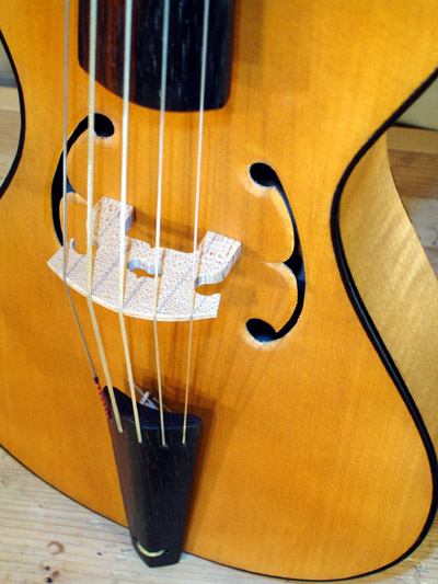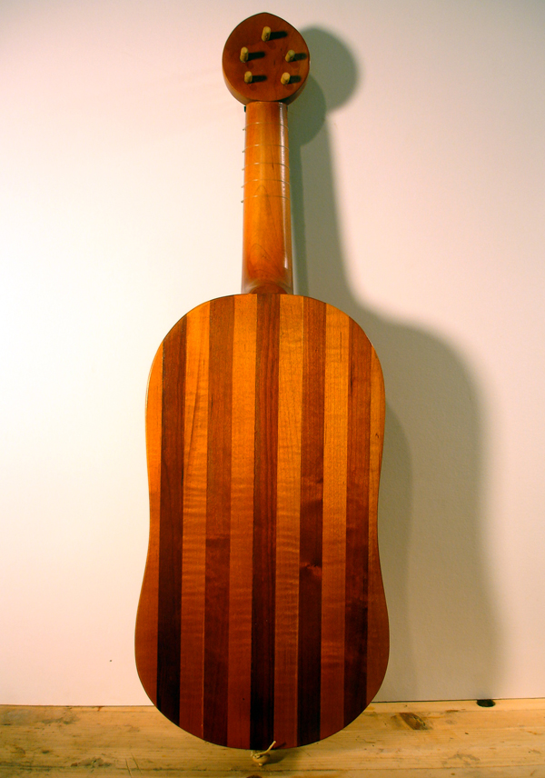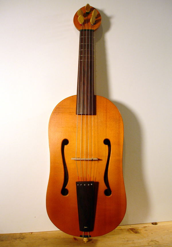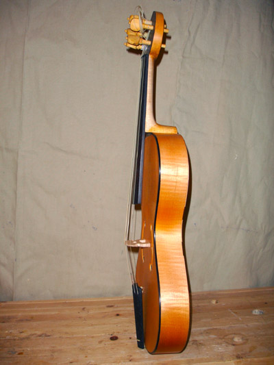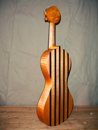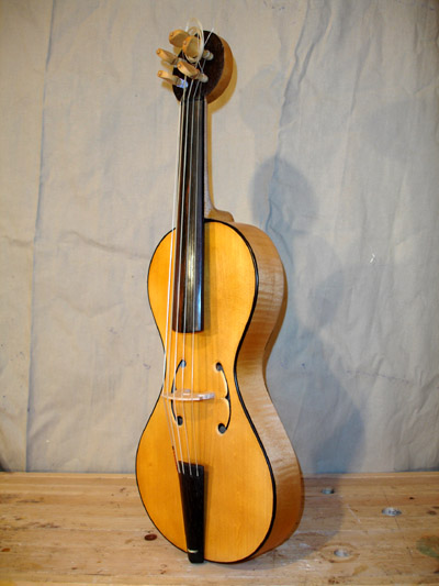 Showing rosewood fingerboard and tailpiece and boxwood fittings. Maple and cherry back stripes. This particular instrument was strung with modern viola strings and nylon tied-on frets.