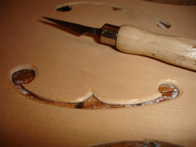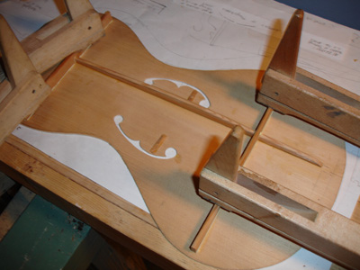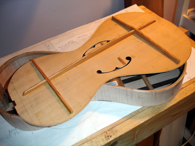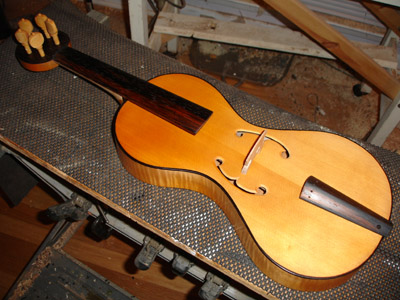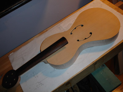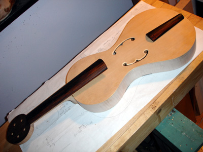 The top is rough cut and rests on the finished body. The soundholes are located. The fingerboard is not attached.