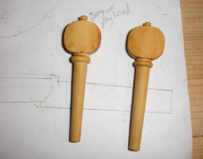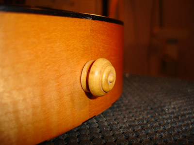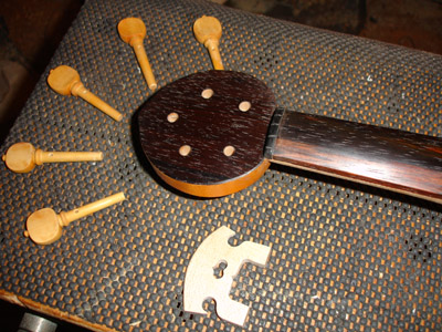 Neck/peg disk with rosewood veneer and boxwood pegs. The fittings of this instrument are unapologetically baroque.
