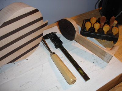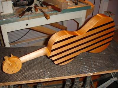 A new vielle of my own pattern for John Hillenbrand of Savannah. The instrument is being customized for John from my original design to have a larger peghead to make tuning easier during performance and the overall body depth is increased for added volume. Here the flame maple ribs are bent around the form and the neck/peghead is rough carved. The striped maple and ebony back is attached.