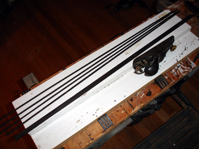 The bass bar is attached and is being shaped. Spars have been added at the weakest portion of the soundholes to prevent cracking. The bass bar is shaped and the cross spars are attached in the manner of a flat-top guitar. Because the vielle top is flat, bass bar and soundpost alone are not enough to keep the soundboard from collapsing. The spars are shaped and the top is ready to be attached to the body. The underside of the tailpiece is being shaped