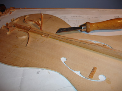 The purfling is attached and is being planed down flush to the table. The dovetail at the neck will be truncated prior to the attachment of the fingerboard.