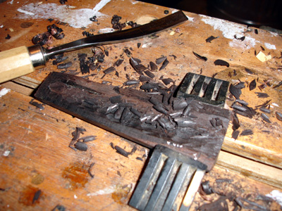 The fingerboard is shaped, first with a spokeshave, then with the block plane. The final shape is obtained with the use of a template.